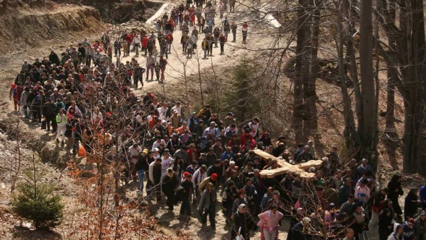 Mii de oameni participă, în dimineaţa din Vinerea Mare, la procesiunea „Drumul Crucii”, din Straja, un eveniment prin care sunt rememorate patimile lui Iisus Hristos, înainte de răstignirea pe Dealul Golgota.