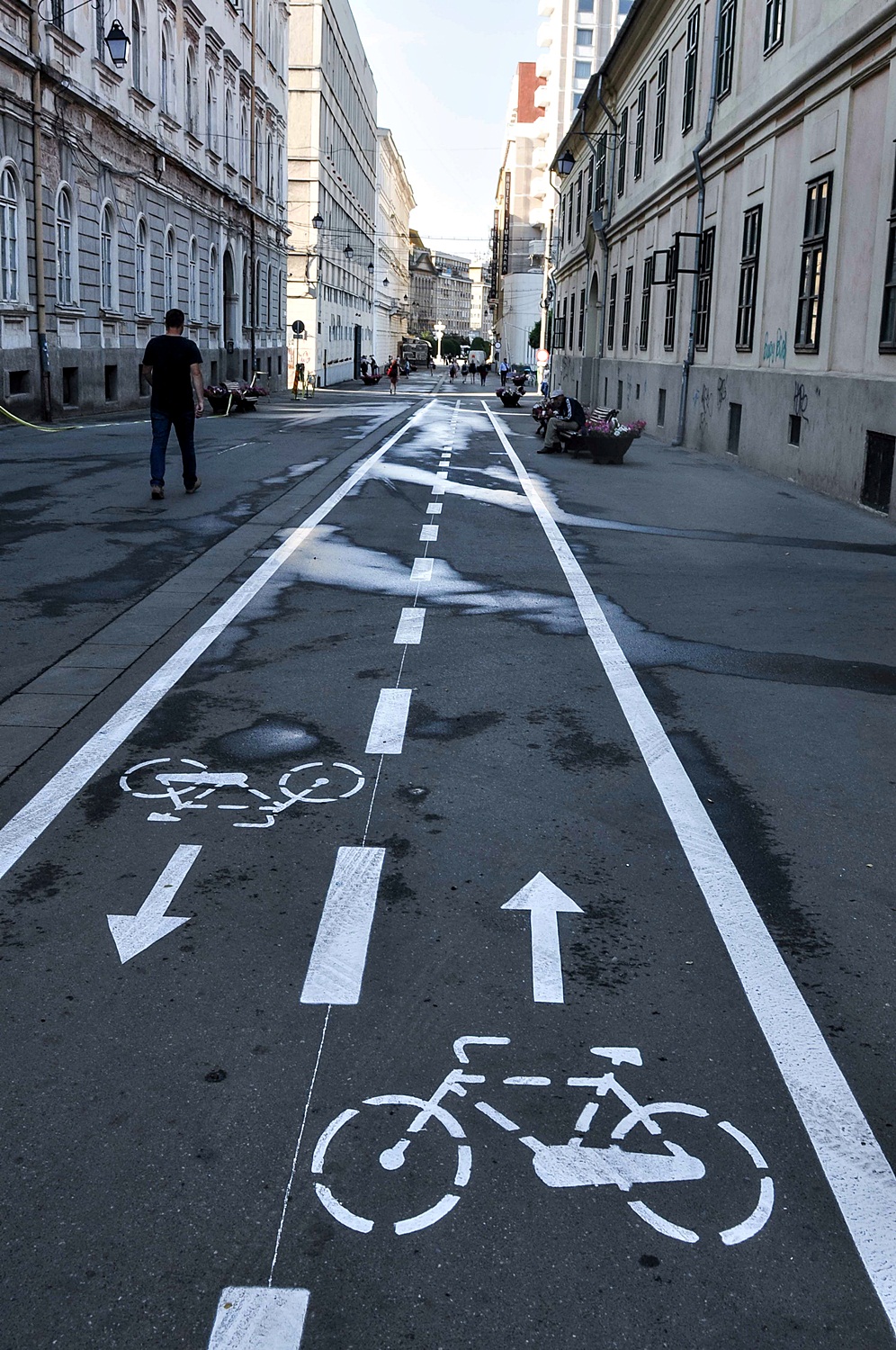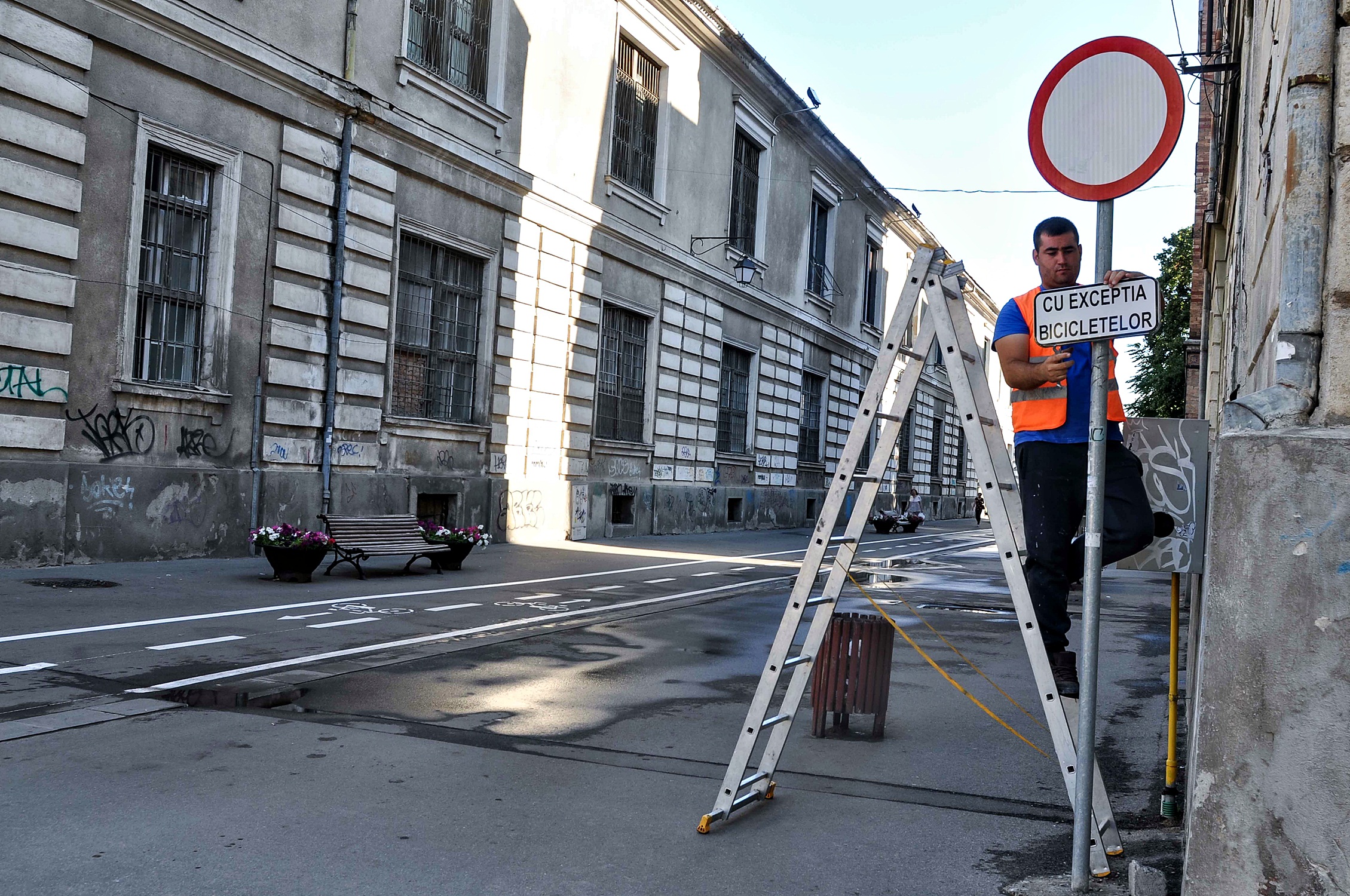 În acest moment se lucrează la montarea indicatoarelor care arată că sunt permise bicicletel în zonă şi de atenţionare pentru tramvaie. Pietonii au la dispoziţie porţiunea de drum între bănci și peretele spitalului militar, unde trotuarul nu este ocupat de terase.