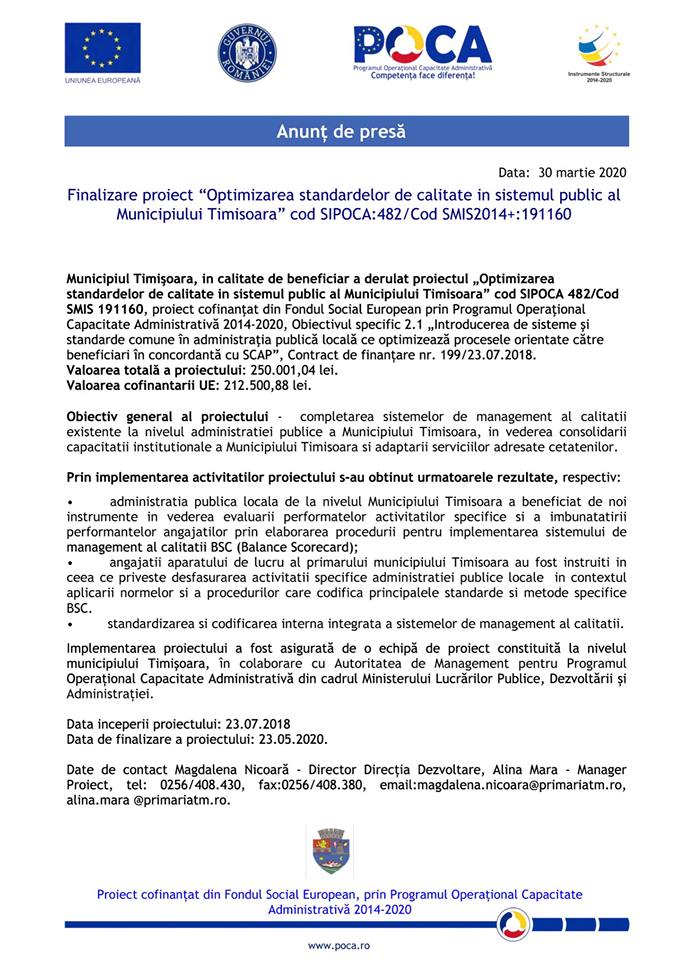 A fost finalizat proiectul “Optimizarea standardelor de calitate in sistemul public al Municipiului Timișoara”