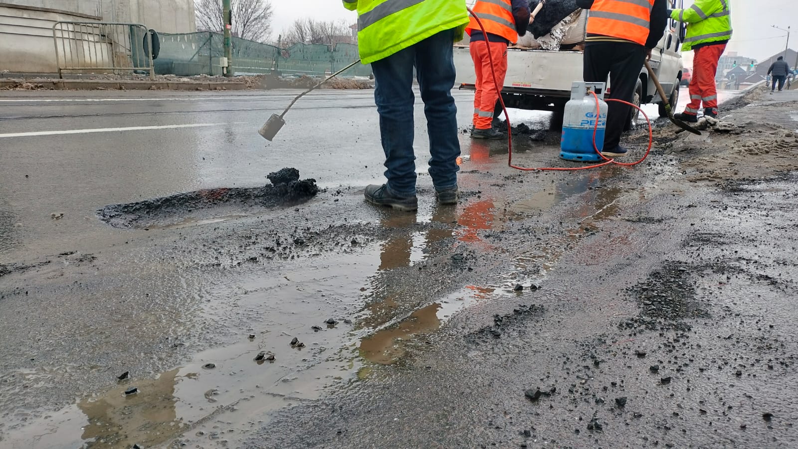 Lucrările realizate acum sunt provizorii și constau în plombări cu asfalt la rece, o soluție aplicată pe timp de iarnă pentru a preveni accidentele și avarierea mașinilor.