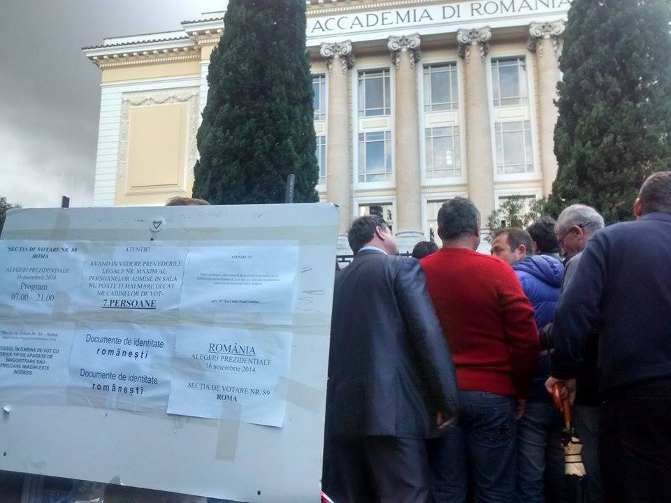 La Roma au fost organizate trei secții de votare, în centrul orașului. La Academia Română din Roma, unde au fost organizate două secţii de votare, aşteaptă în acest moment peste 1000 de persoane. Pentru cei aflaţi la capatul cozii, coadă care se întinde pe circa 300-400 de metri, se estimeaza o perioadă de aşteptare de cel puţin 2-3 ore.