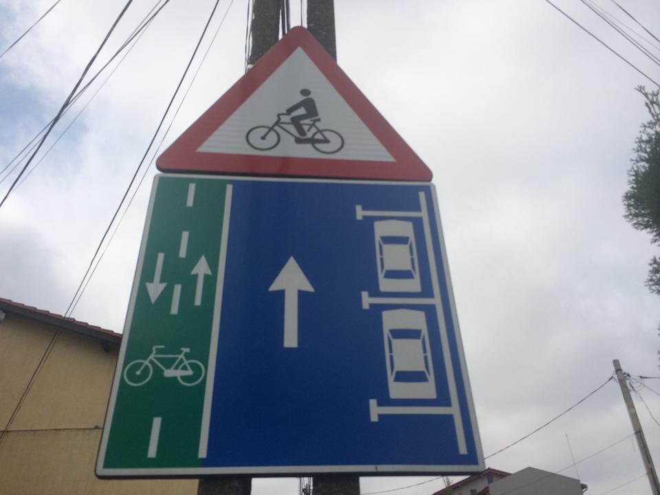 Abordarea prevede modificarea profilului stradal al unei străzi cu sens unic, fără circulaţie intensă, prin realizarea unei piste pentru biciclete dublu-sens, bandă de circulatie, respectiv locuri de staţionare paralele cu axul drumului.