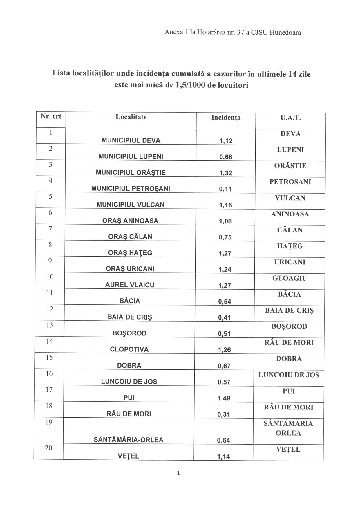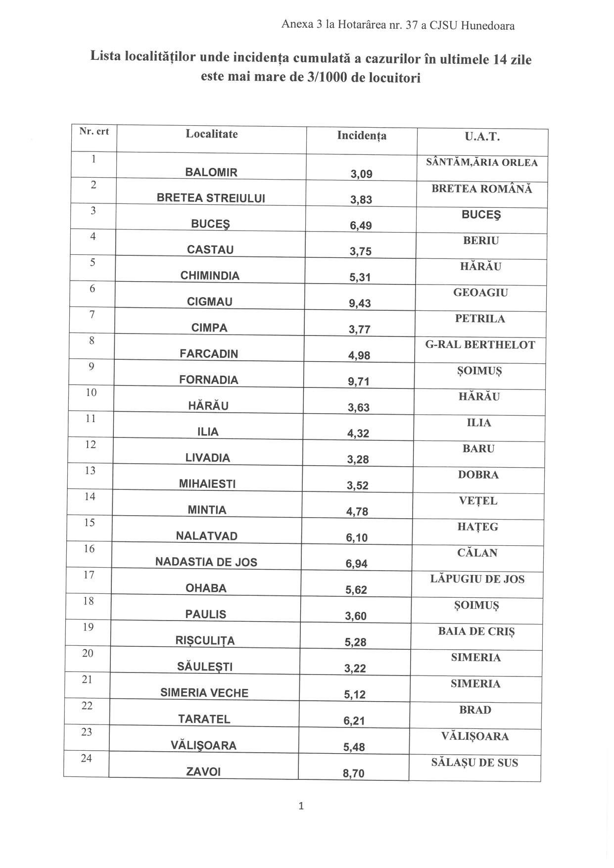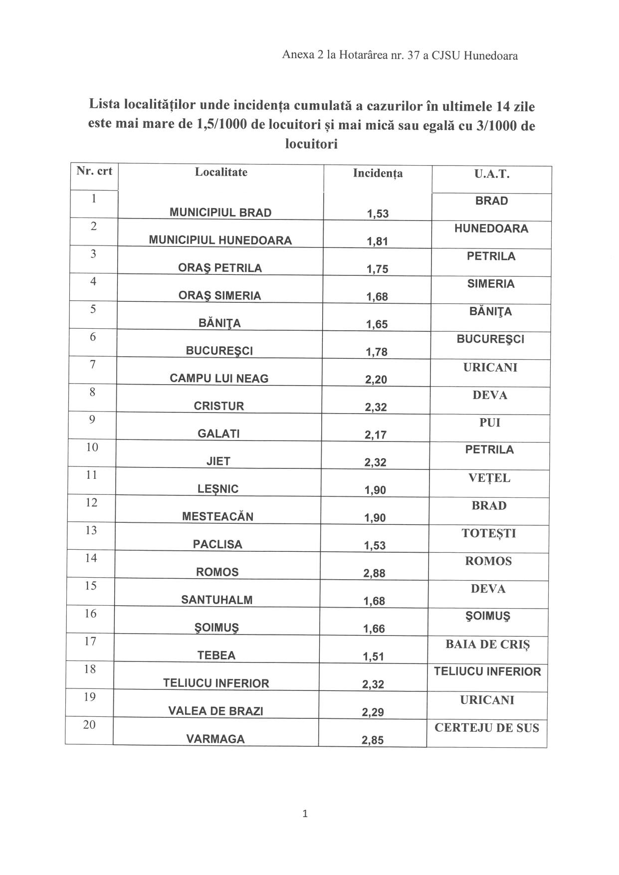 În alte 20 de localităţi ale judeţului, între care oraşele Brad, Hunedoara, Petrila şi Simeria, a fost calculată o incidenţă a cazurilor de COVID-19 mai mare de 1,5 la 1.000 de locuitori, fără să fie depăşită limita de 3 la 1.000 de locuitori.