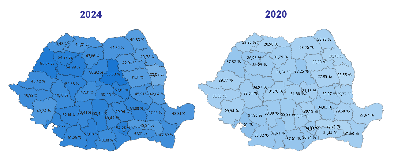 Update – Situații pe județe, la ora 21:00, la închiderea votării (comparativ cu 2020)