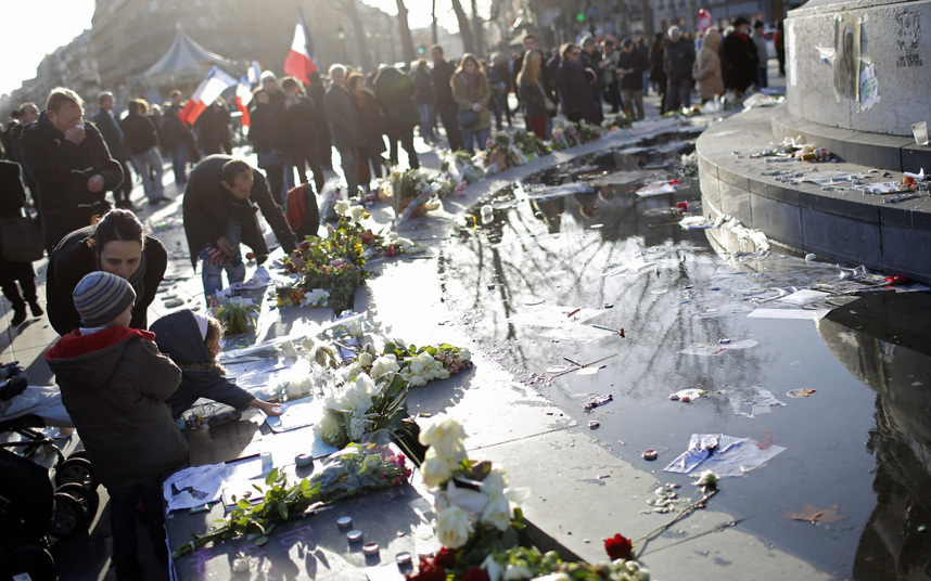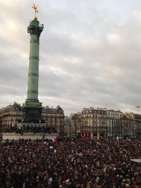Numeroşi manifestanţi fotografiau florile şi sloganurile, printre care deja celebrul „Je suis Charlie”, lângă statuia Republicii din centrul pieţei de unde va începe marşul republican, în prezenţa a zeci de echipe de televiziune din toată lumea.