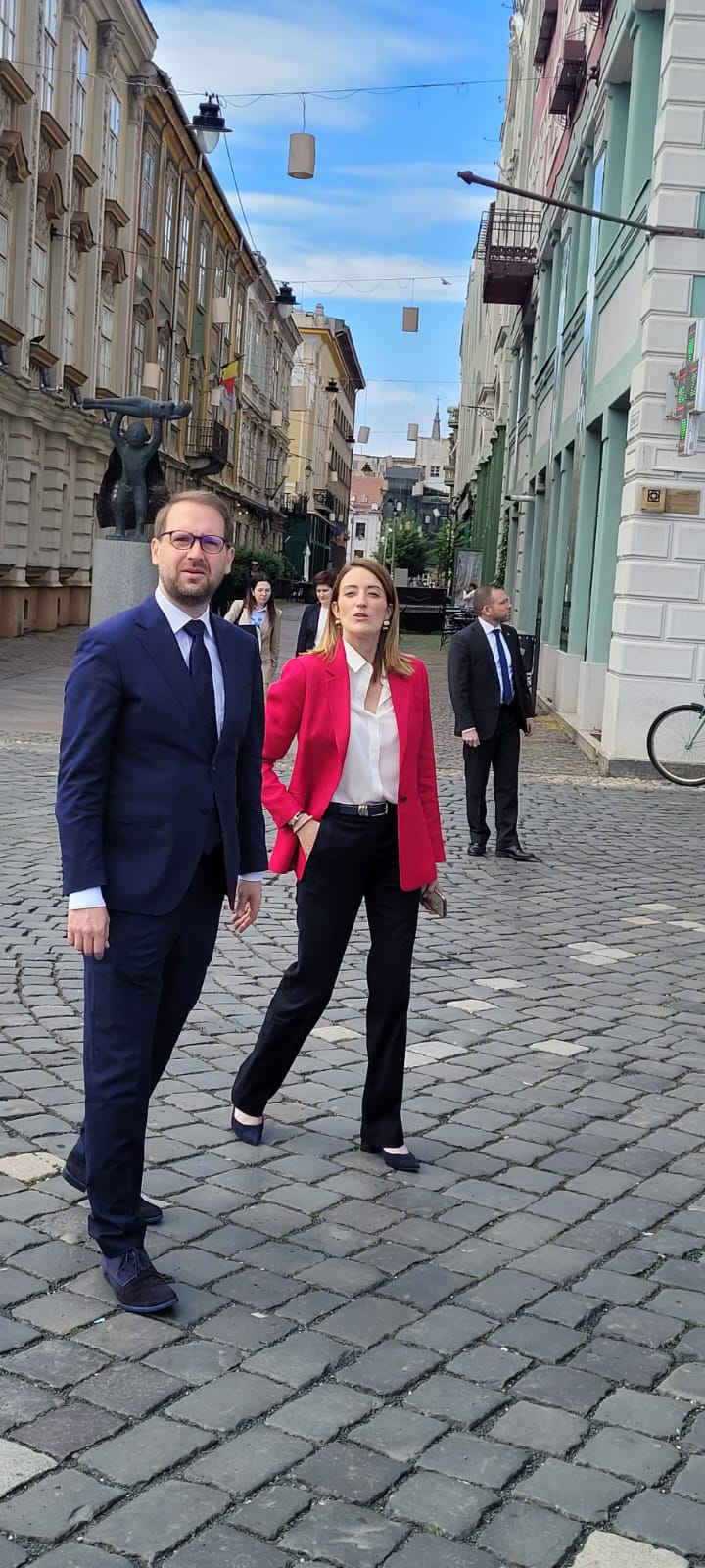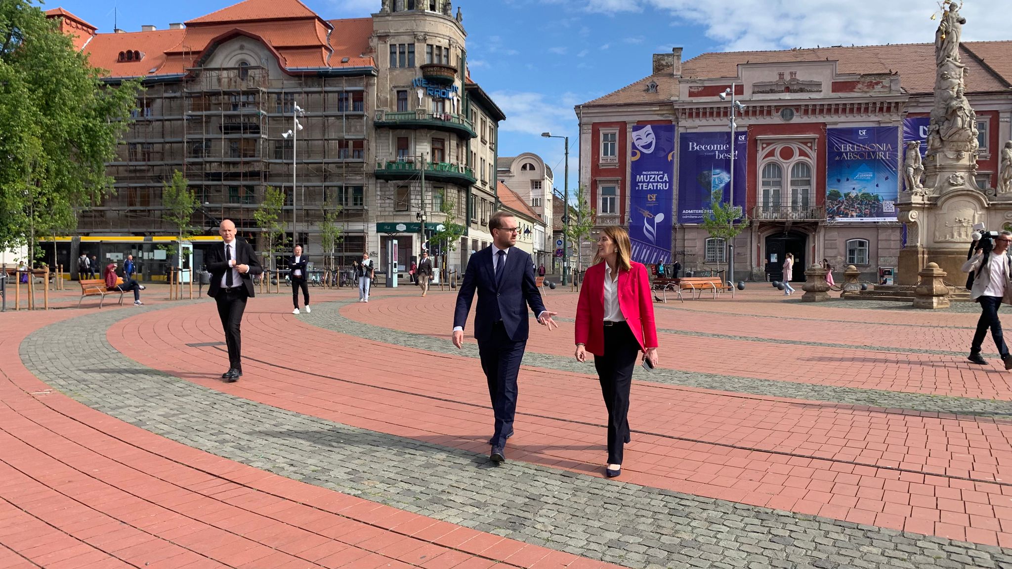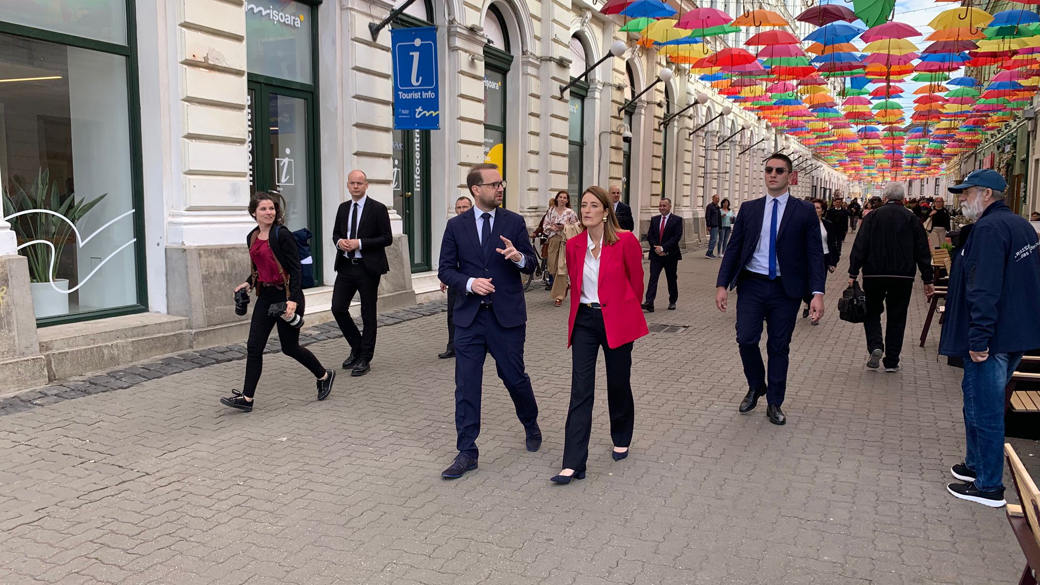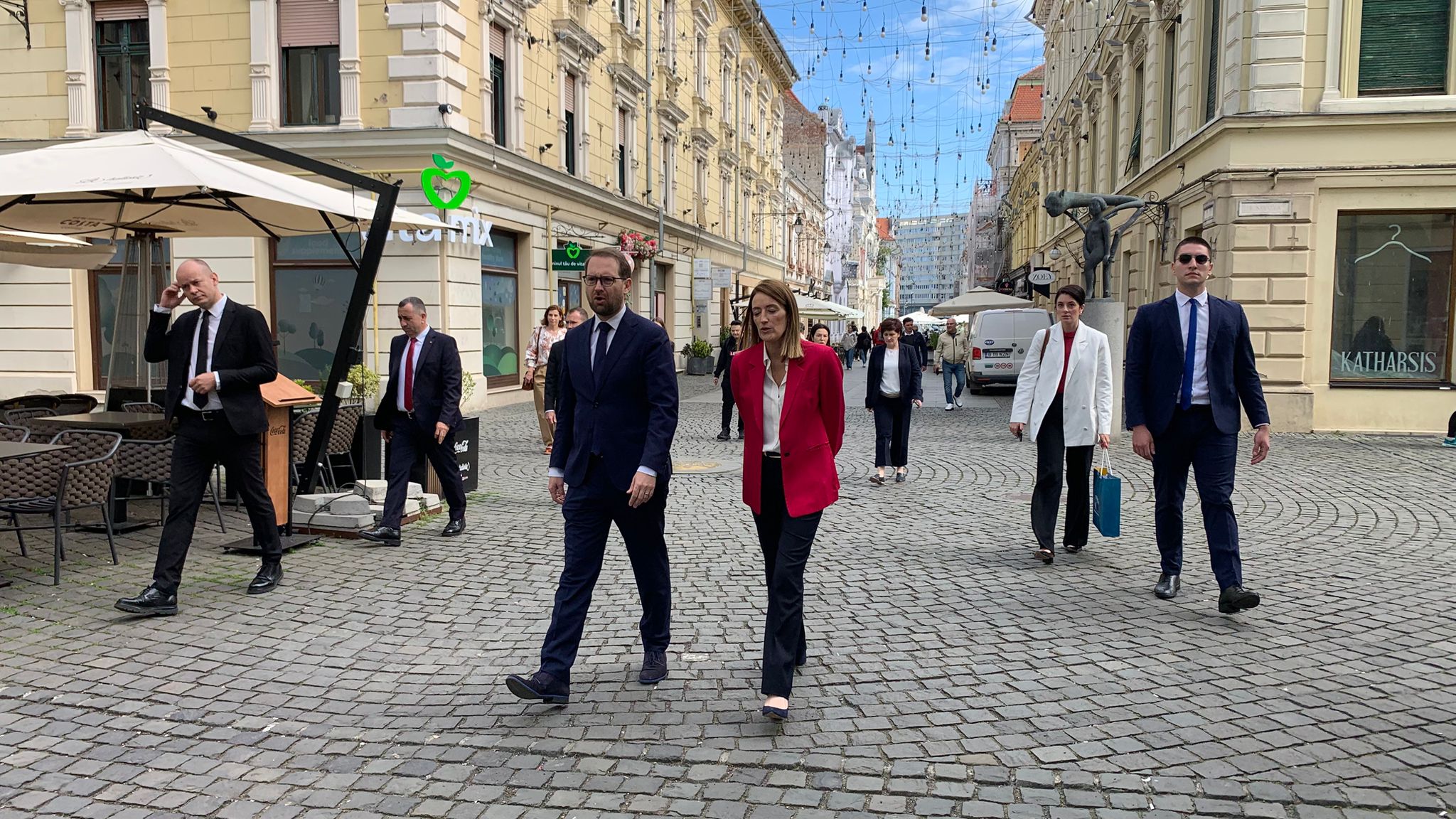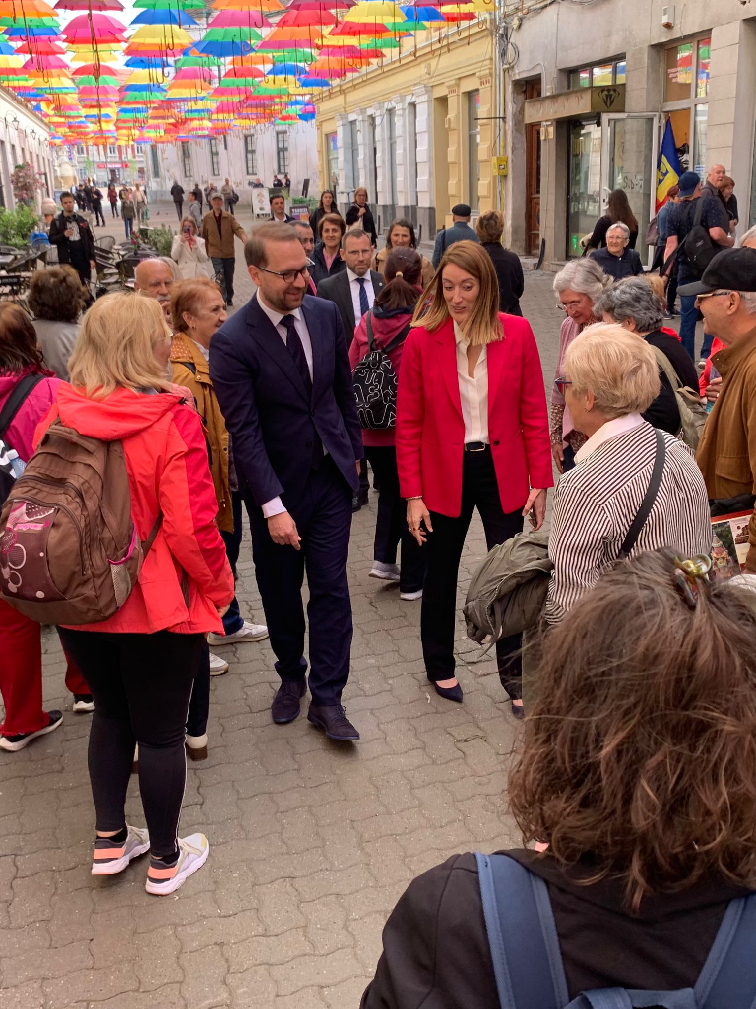 Din Piața Unirii, pe sub umbrelele de pe strada Alba Iulia, iar apoi în Piața Victorei, Roberta Metsola a vizitat centrul orașului pe care l-a numit unul al “schimbării și al curajului”.