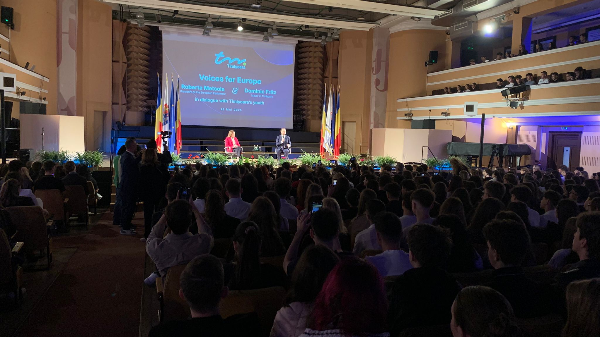 Sute de tineri din Timișoara, dar și alte orașe ale țării s-au întâlnit astăzi la Sala “Capitol”, cu președinta Parlamentului European, Roberta, Metsola.