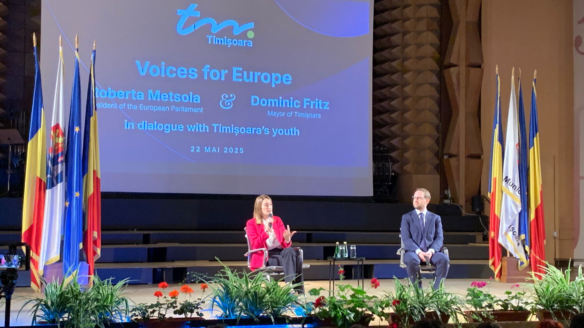 Președinta Parlamentului European, Roberta Metsola,se află astăzi la Timișoara, unde a discutat cu peste 800 de tineri din întreaga țară, în cadrul unui eveniment organizat la Sala „Capitol”. În timpul întâlnirii, Metsola a transmis un mesaj de încurajare și unitate europeană: „Speranța strălucește aici, în România.”