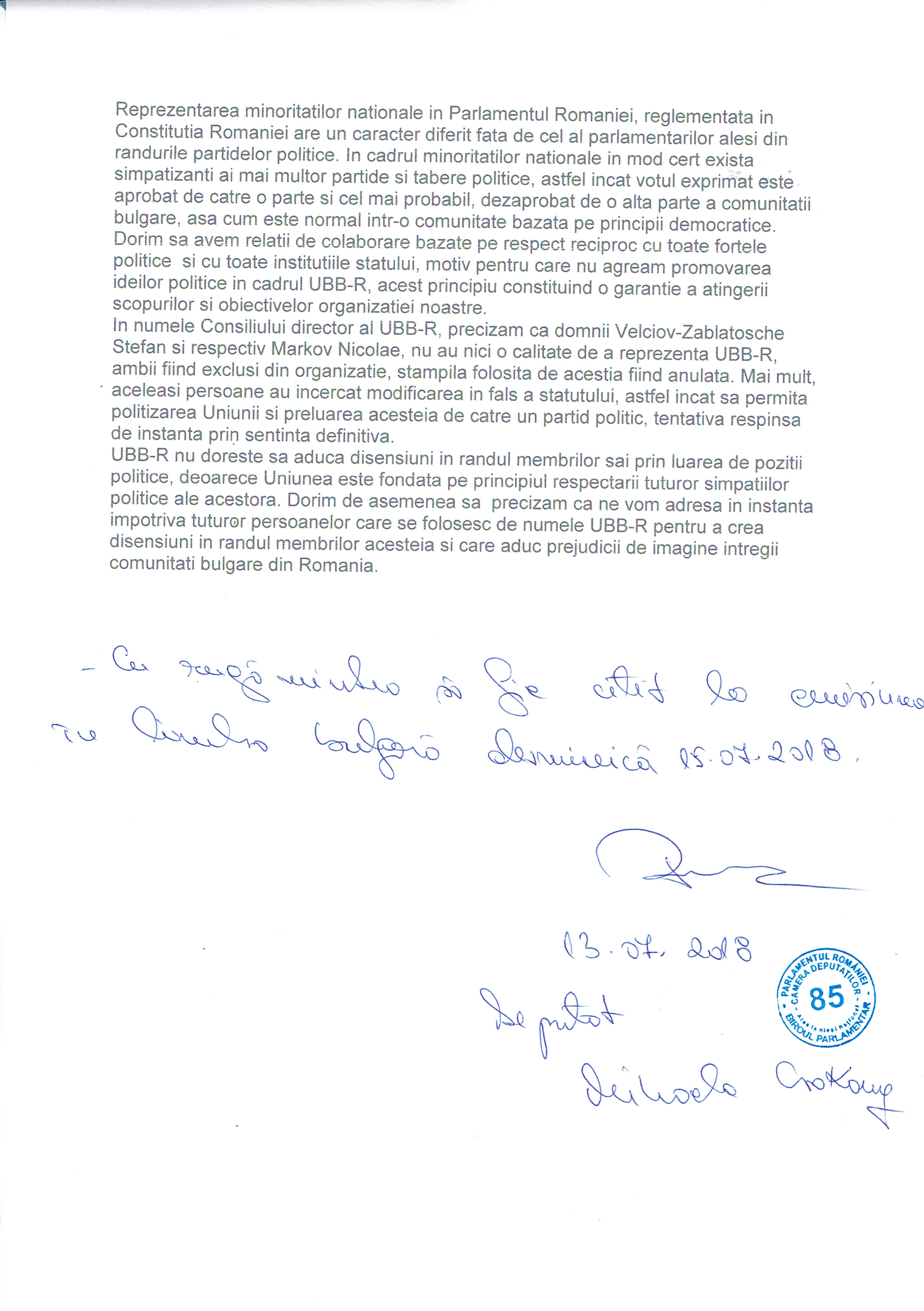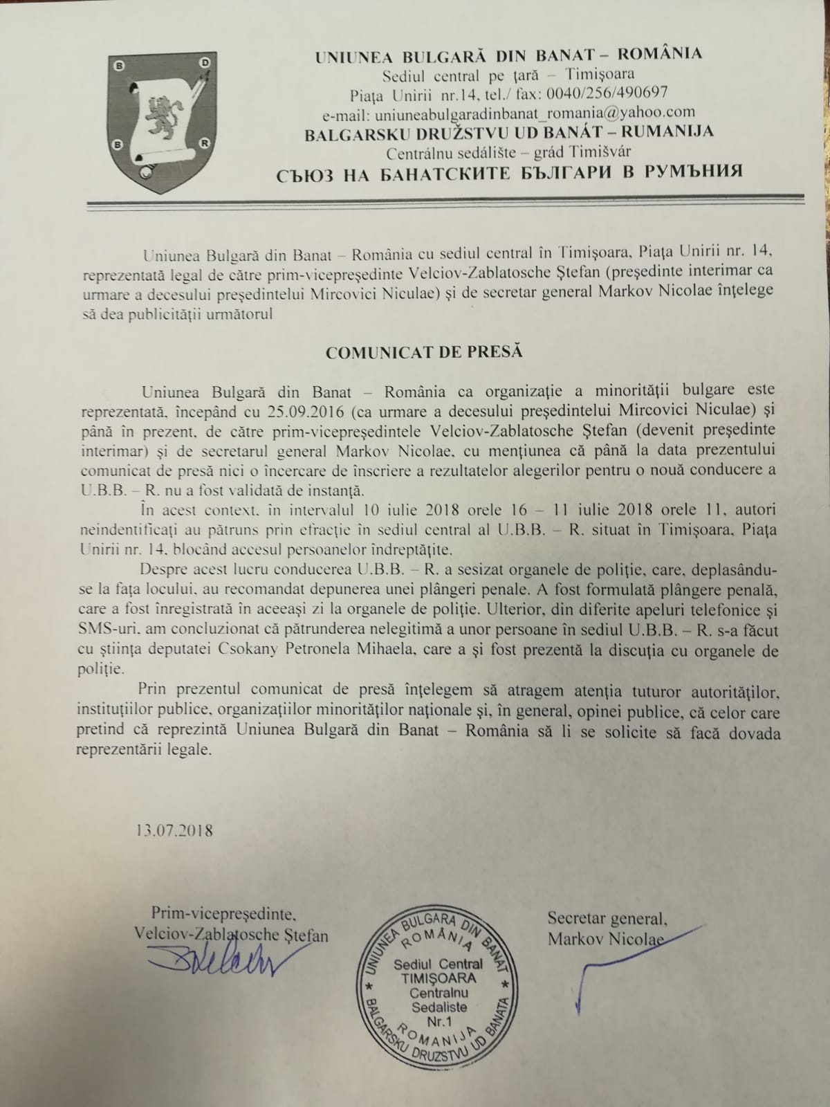 Preşedintele interimar Ştefan Velciov a depus o plângere la Poliţie pe numele lui Csokany pe motiv că ar fi adus în sediul Uniunii persoane care să le blocheze accesul lui şi secretarului general, Nicolae Markov.