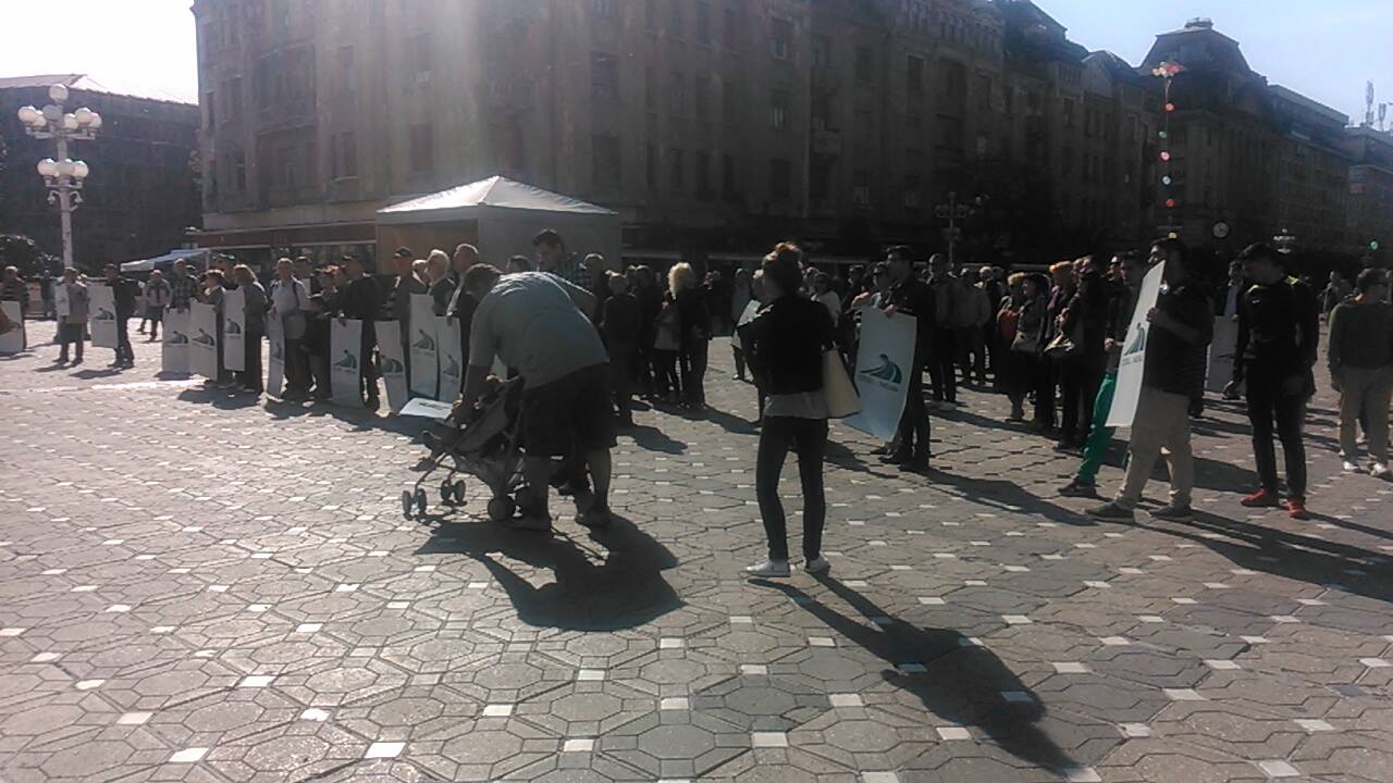 La ora 11:00, anunțată pentru începerea mitingului, numărul celor de la terase era mult mai mare decât al celor aflați efectiv pe platoul din fața Operei.