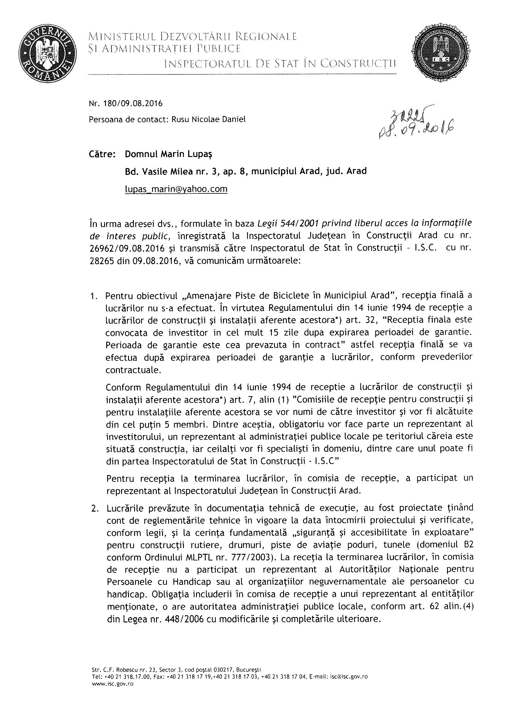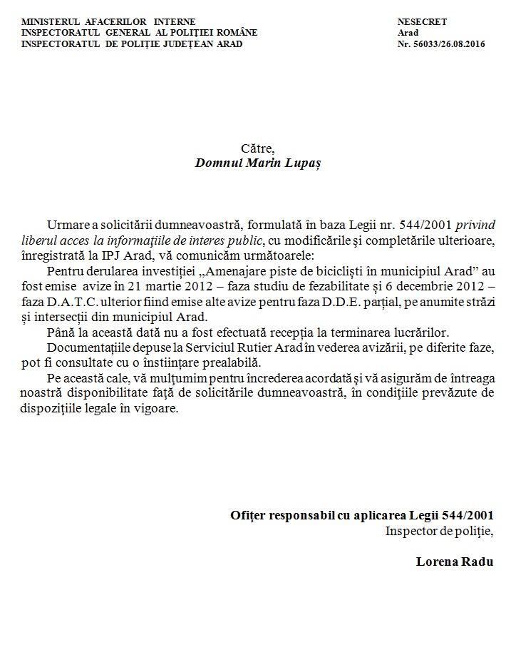 Marin Lupaş susţine că administrația locală minte și dezinformează, iar pistele nu au fost recepţionate la finalul anului 2015, aşa cum a răspuns la solicitarea unui arădean. Consilierul independent a prezentat şi răspunsuri în acest sens primite de la Inspectoratul de Stat în Construcții şi de la Inspectoratul de Poliție Județean Arad.