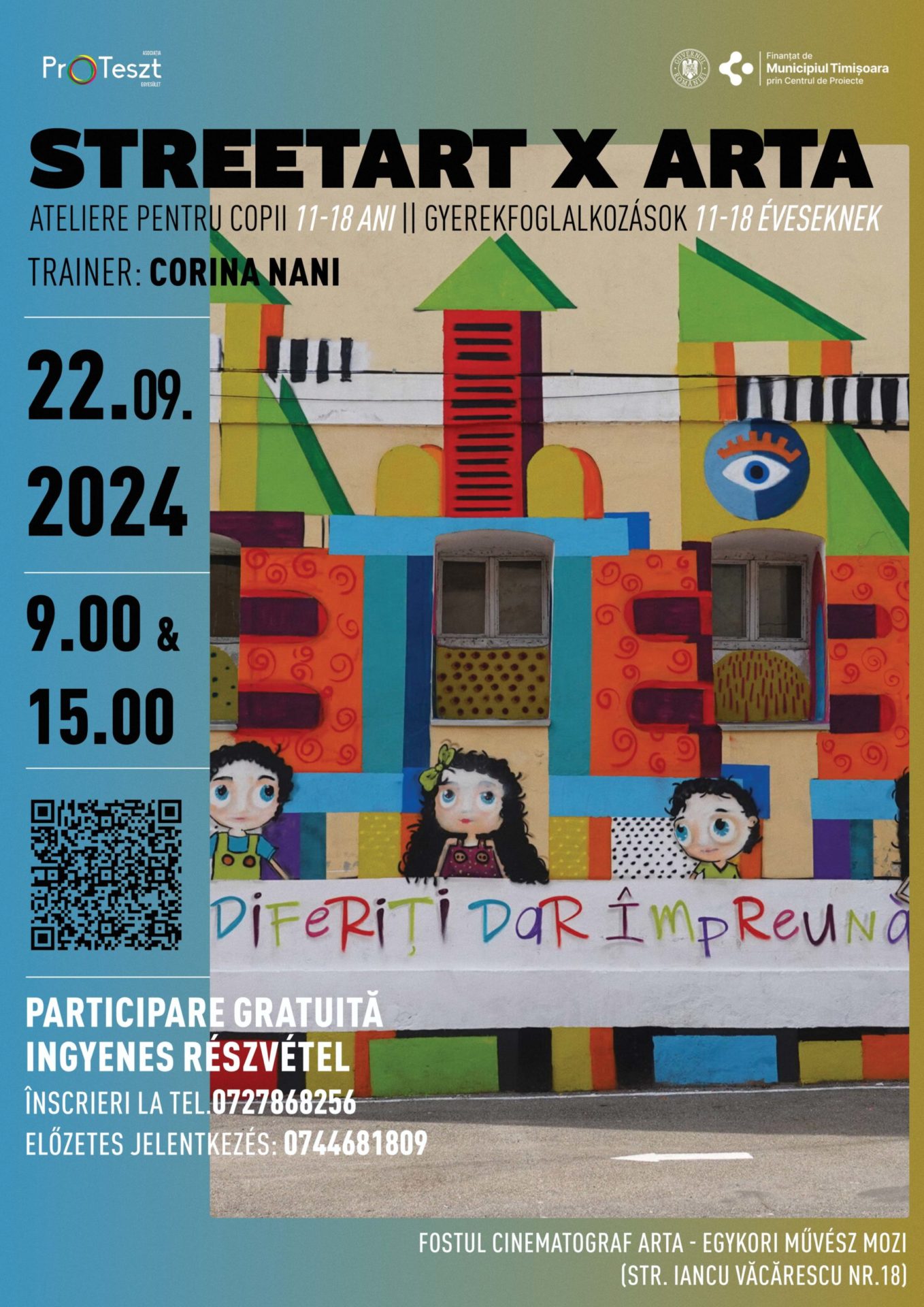 Asociația Proteszt continuă proiectul „Streetart x Arta – ateliere pentru copii” cu două sesiuni de artă urbană duminică, 22 septembrie 2024, începând cu ora 9.00, la fostul cinema Arta din Timișoara. Proiectul oferă copiilor ocazia de a folosi sprayuri grafitti și pensule pentru pictură murală sub coordonarea profesoarei Corina Nani de la Universitatea de Vest.