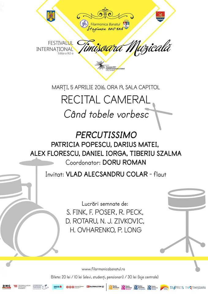 În cadrul Festivalului Internațional Timișoara Muzicală, Filarmonica Banatul vă invită la recitalul cameral ”Când tobele vorbesc”, susținut de Ansamblul Percutissimo, coordonat de Doru Roman.