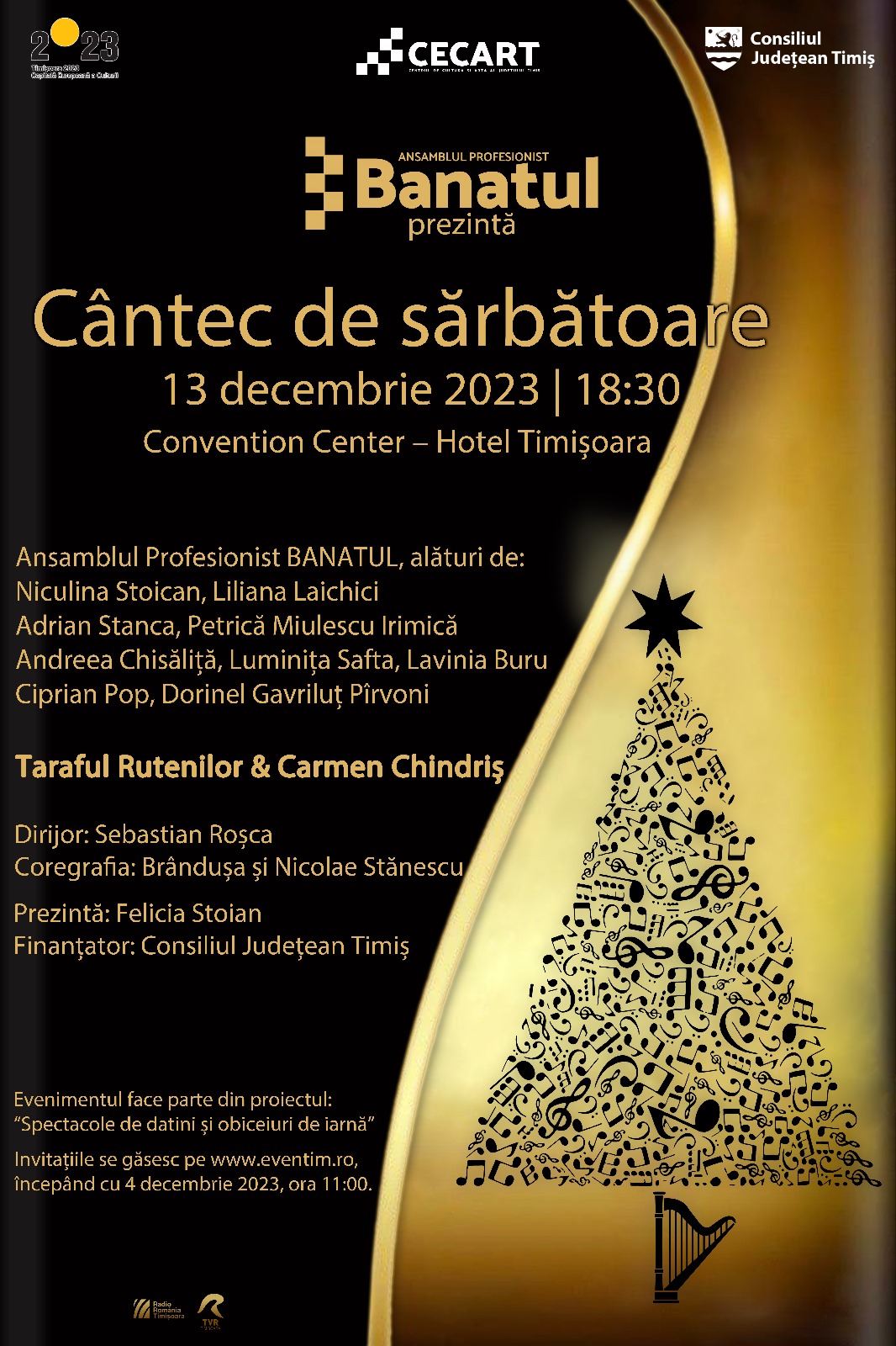 Miercuri, 13 decembrie 2023, ora 18:30, sunteți invitați la spectacolul ”Cântec de sărbătoare” la Convention Center – Hotel Timișoara care vă va purta în atmosfera magică a sărbătorilor de iarnă.
