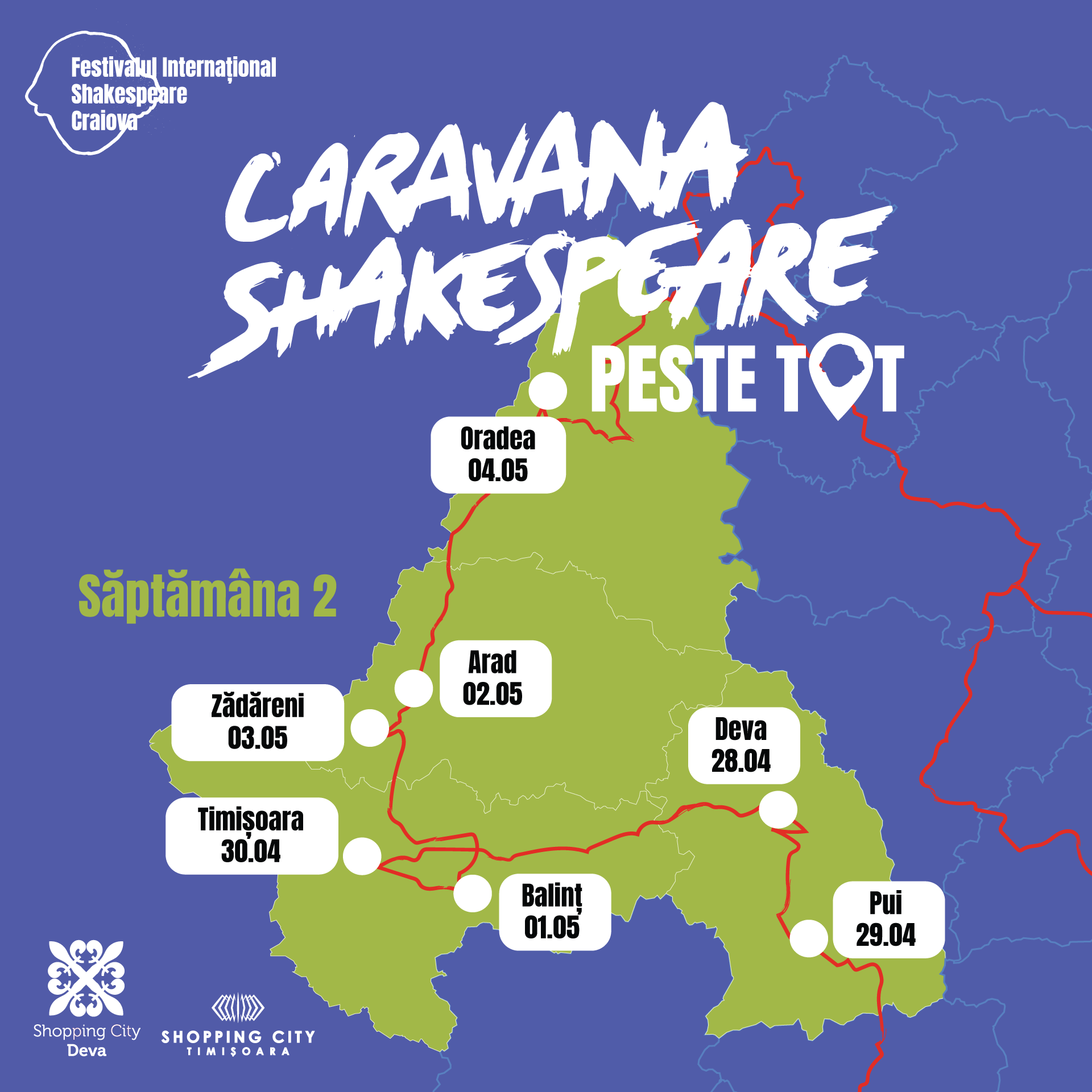 Pe 30 aprilie, de la ora 14.00, Caravana ajunge în parcarea Shopping City Timișoara, iar pe 1 mai, de la ora 12.00, în parcarea primăriei Balinț.