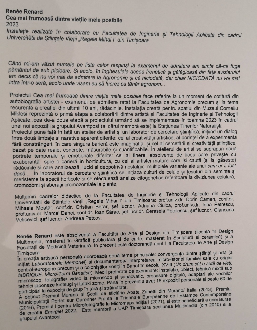 Proiectul ”Cea mai frumoasă dintre viețile mele posibile” face referire la un moment de cotitură din autobiografia artistei — examenul de admitere ratat la Facultatea de Agronomie. Instalația creată pentru spațiul din Muzeul „Corneliu Miklosi” reprezintă o primă etapă a colaborării dintre artistă și Facultatea de Inginerie și Tehnologii Aplicate, a doua etapă urmând să se materializeze în toamna anului 2023, în cadrul unei noi expoziții a grupului Avantpost la Stațiunea Tinerilor Naturaliști.