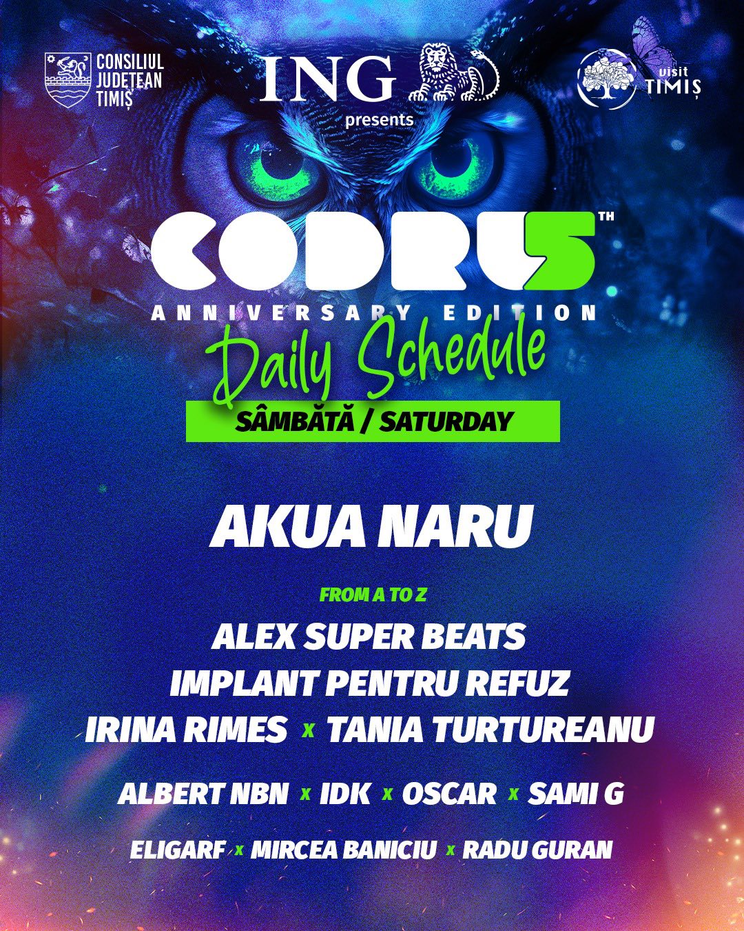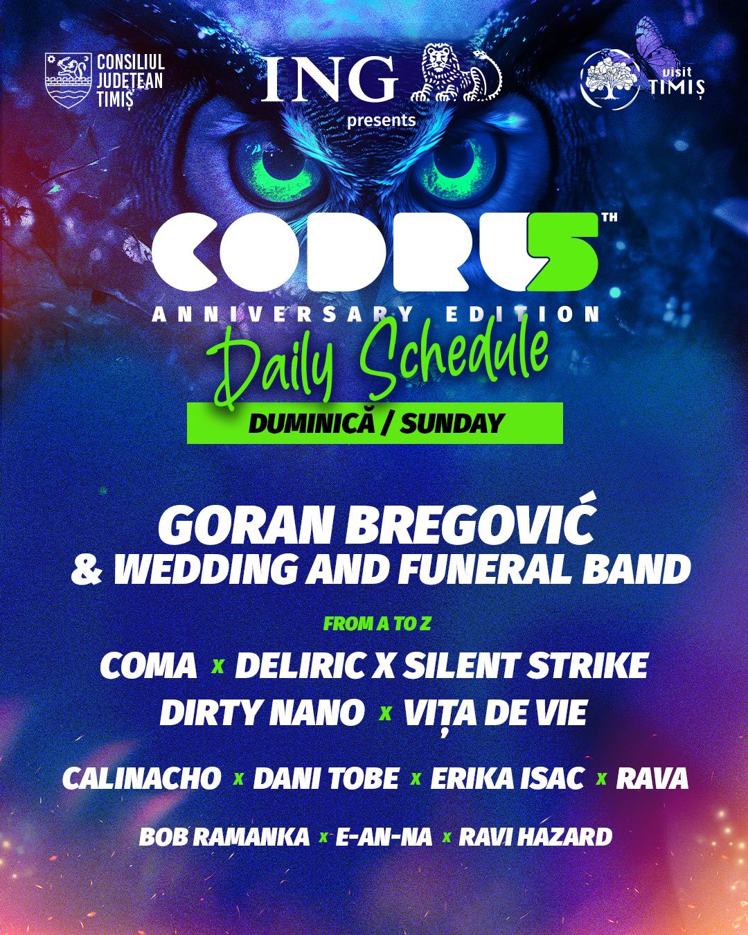 Pe scenele festivalului vor urca artiști internaționali și români de excepție. Printre aceștia, Akua Naru (SUA), una dintre cele mai importante voci feminine ale hip-hop-ului global, legendarul Goran Bregović & Wedding and Funeral Band, grupul georgian Trio Mandili, dar și nume consacrate din România: Subcarpați, Irina Rimes, Deliric x Silent Strike, Phoenix, Vița de Vie, COMA sau Dirty Shirt.