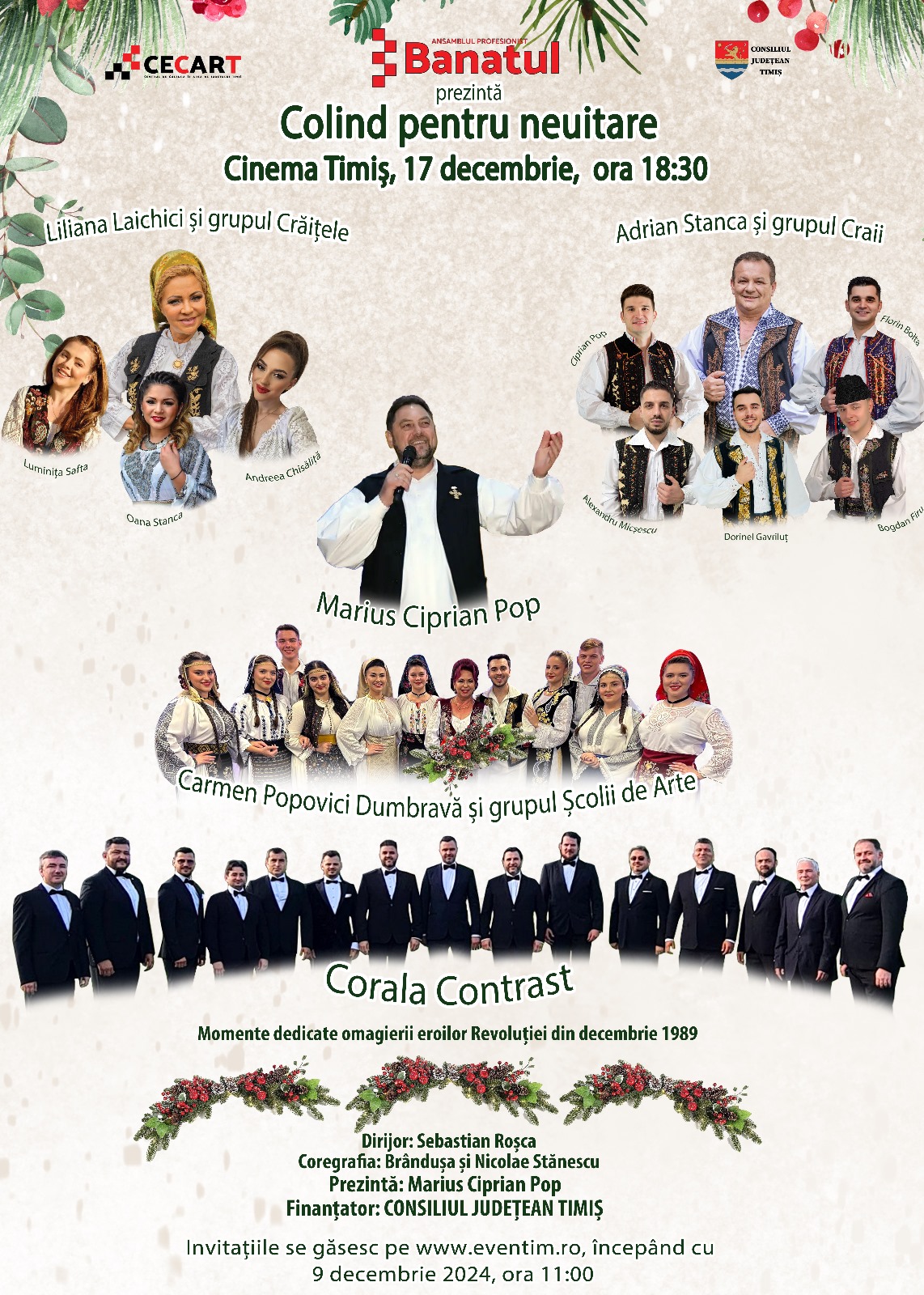 Cu gândul la Nașterea Domnului și la cei al căror sacrificiu și curaj ne-au dat nouă, celor de astăzi, dreptul de a sărbători Crăciunul în libertate, cu gândul la lumea și viața nouă ce s-au născut în această zi, Centrul de Cultură și Artă al Județului Timiș vă invită la ”Colind pentru neuitare” marți, 17 decembrie 2024, de la ora 18:30, la Cinema Timiș.