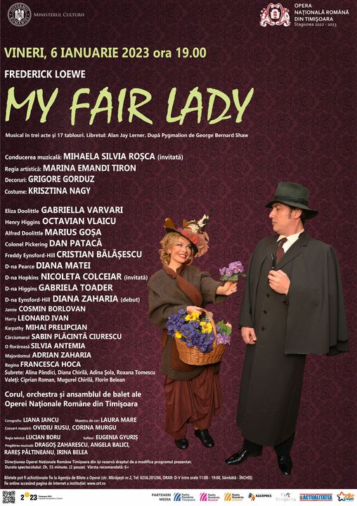 „My Fair Lady”, cel mai cunoscut musical al secolului XX, o comedie muzicală inspirată de mitul lui Pygmalion bazată pe libretul operetei compusă de Frederick Loewe şi piesa lui G. B. Shaw, va putea fi urmărit pe scena Operei Române Timișoara vineri, 6 ianuarie 2023, de la ora 19.00.