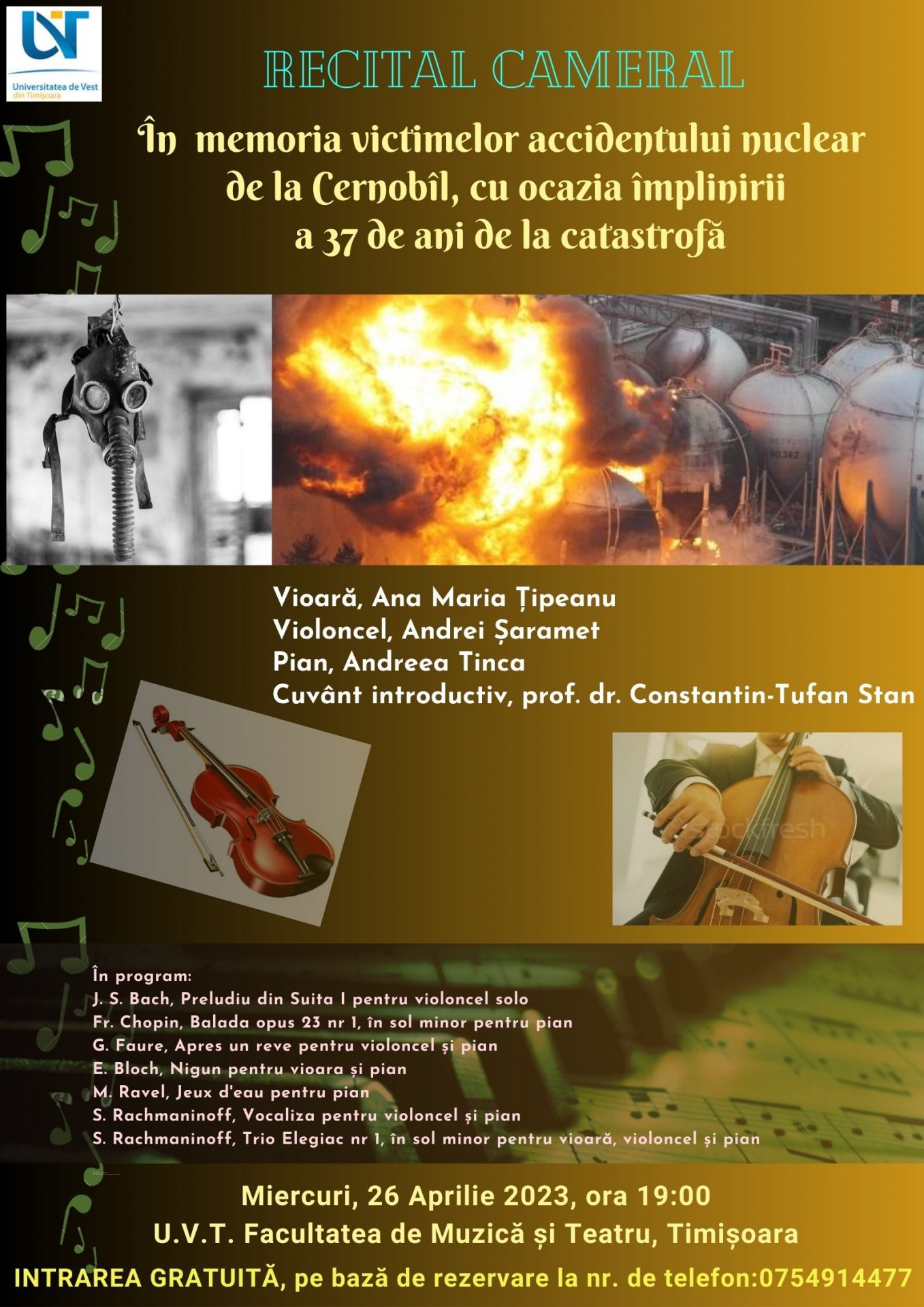 Sala Orpheum a Facultății de Muzică și Teatru din Timisoara găzduiește miercuri, 26 aprilie 2023, de la ora 19.00, un concert cameral în memoria victimelor accidentului nuclear de la Cernobîl, la împlinirea a 37 de ani de la catastrofă.