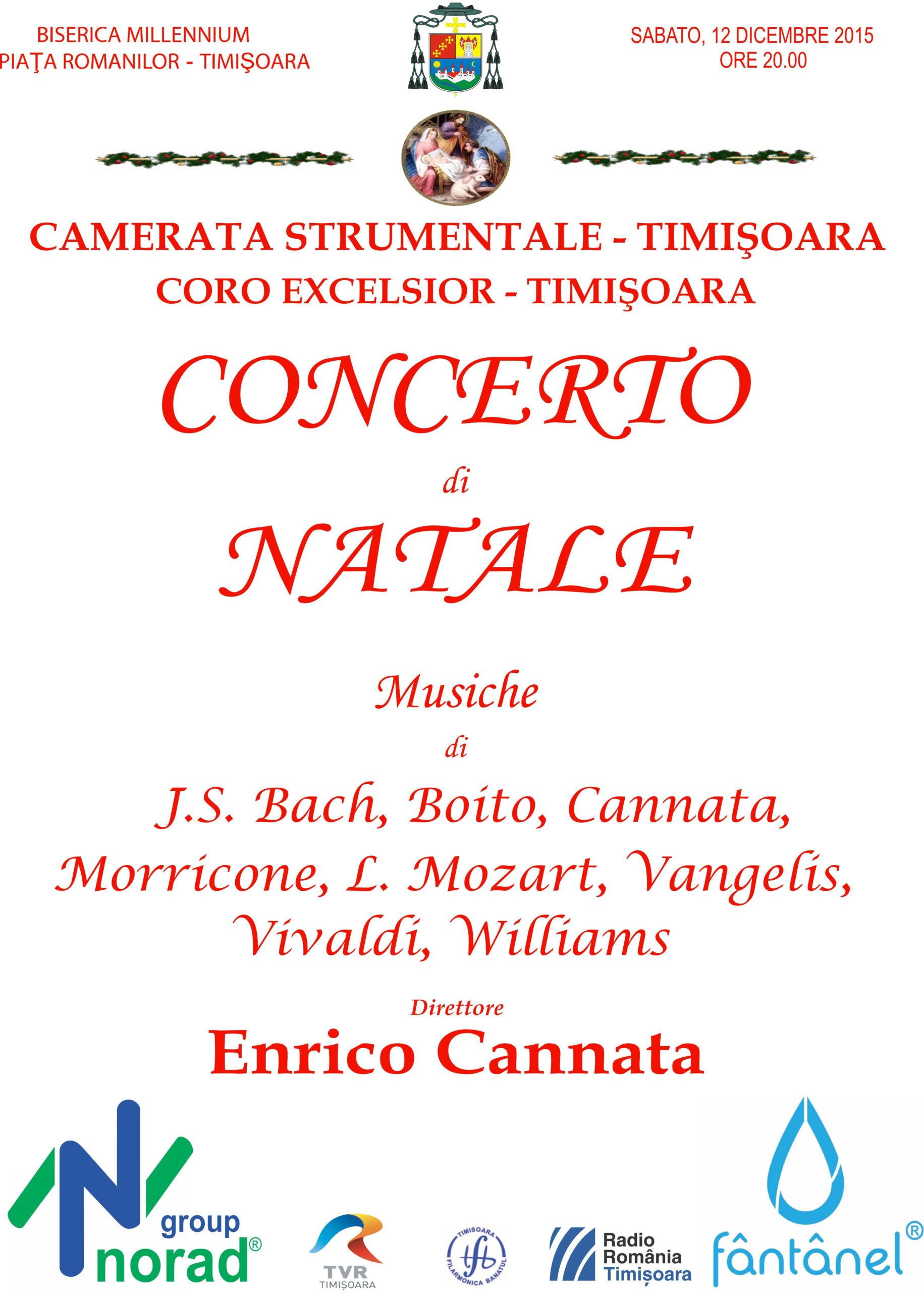 12 decembrie 2015 @ 20:00 – 22:00 – Vă invităm la Biserica Milenium din Timişoara (p-ţa Traian) la tradiţionalul „Concerto di Natale” – concertul de Crăciun. Interpretează Orchestra „Camerata Strumentale” al cărei fondator şi dirijor este maestrul Enrico Cannata, alături de corul de cameră „Excelsior”, formaţie înfiinţată şi dirijată de maestrul Iosif Todea.