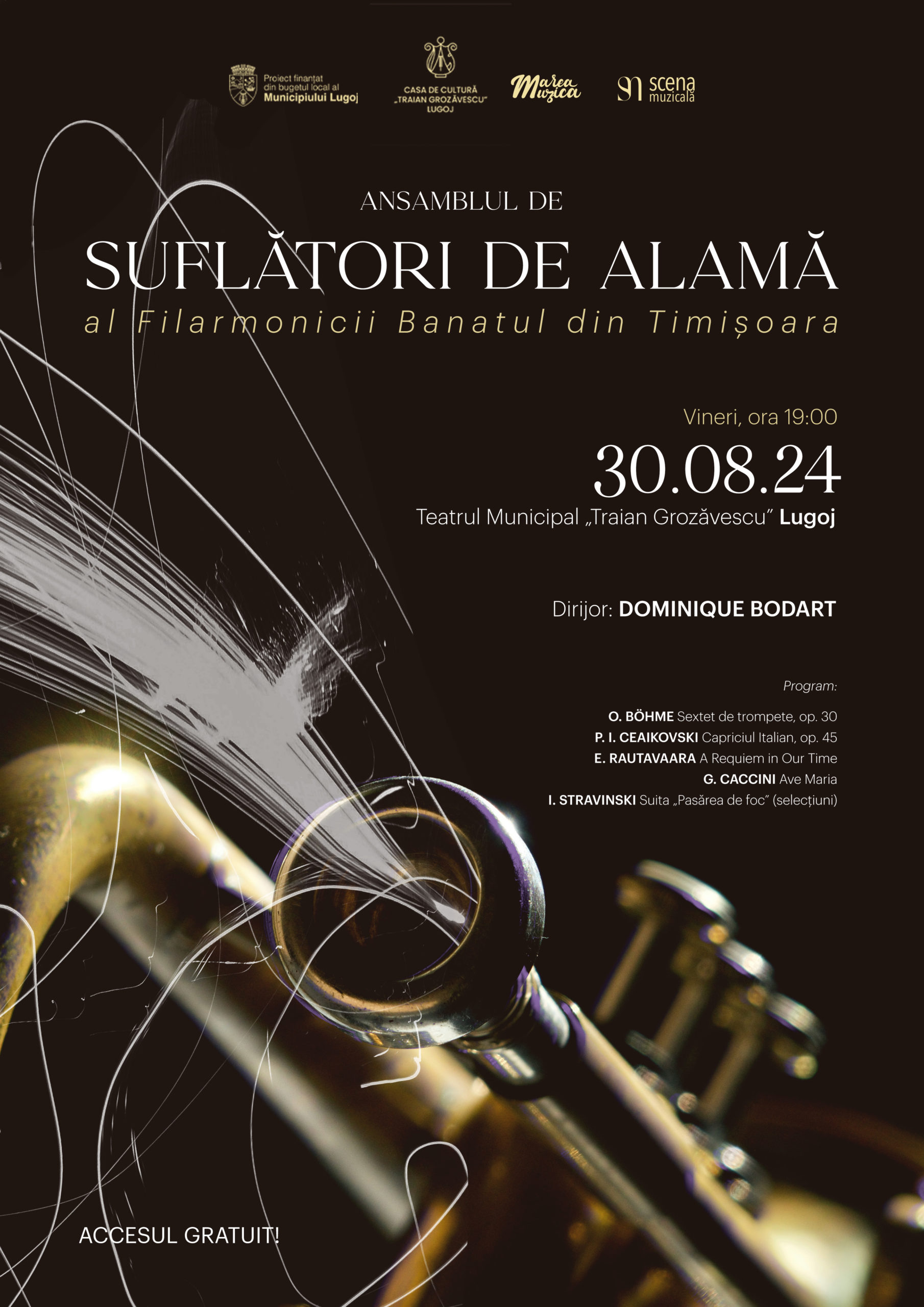 Artiștii Ansamblului de Alamă al Filarmonicii „Banatul” Timișoara, sub conducerea lui Dominique Bodart susțin vineri, 30 august 2024, de la ora 19.00, un nou concert de excepție la Teatrul Municipal „Traian Grozăvescu” din Lugoj.