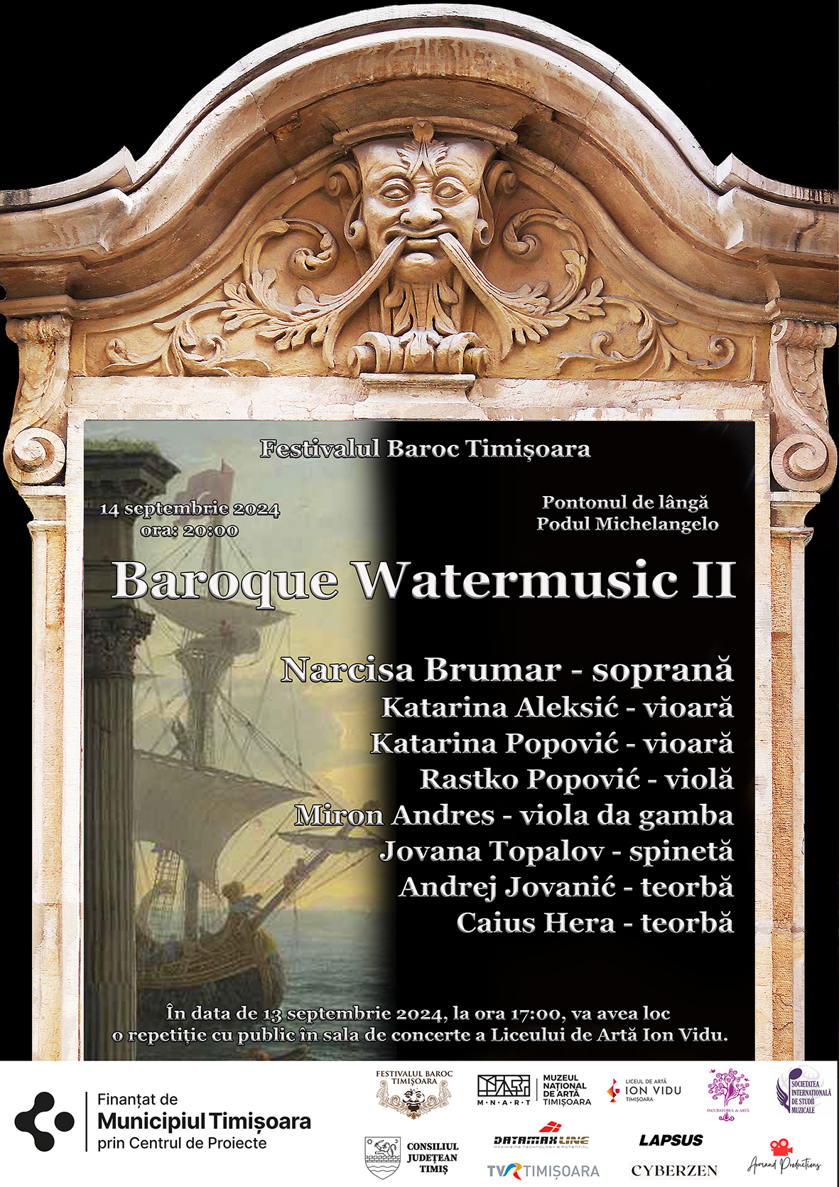 Un nou eveniment din cadrul proiectului Baroque Watermusic II va avea loc sâmbătă, 14 septembrie 2024. De data aceasta, muzicienii vor fi îmbrăcați în costume de epocă și vor interpreta muzică barocă pe instrumente istorice, pe Bega, pe pontonul de lemn de lângă podul Michelangelo, de la ora 20.00. Pontonul va fi amenajat, la rândul lui, în stil Baroc, iar astfel, publicul va putea avea o experiență completă a unui concert baroc, realizat într-o manieră cât se poate de autentică.