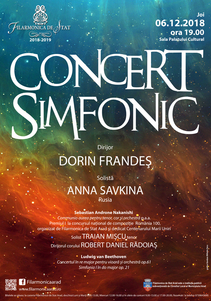 Programul continuă cu partituri de Ludwig van Beethoven. După marile concerte pentru vioară de Piotr Ilici Ceaikovski și Johannes Brahms, intepretate în prima parte a anului muzical 2018, Anna Savkina revine în această iarnă pe scena Filarmonicii, cu o versiune plină de acuratețe a Concertului pentru vioară și orchestră în re major op.61 de Ludwig van Beethoven. Este punctul de culminație a serii, care se încheie cu prima simfonie beethoveniană, cea în do major op. 21.