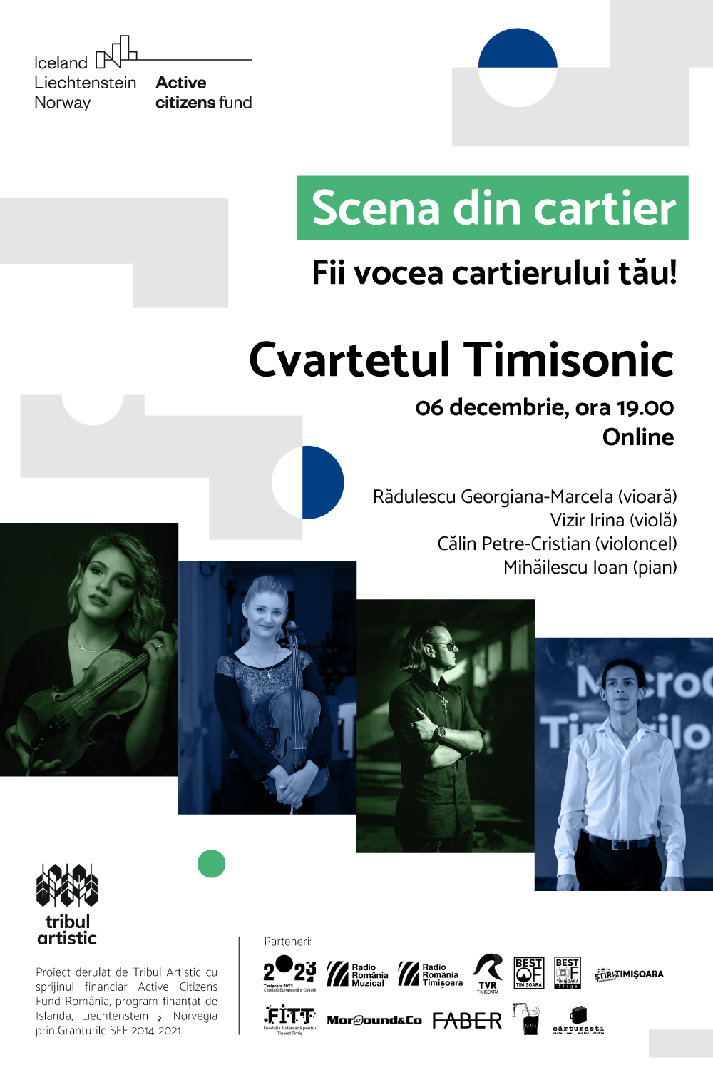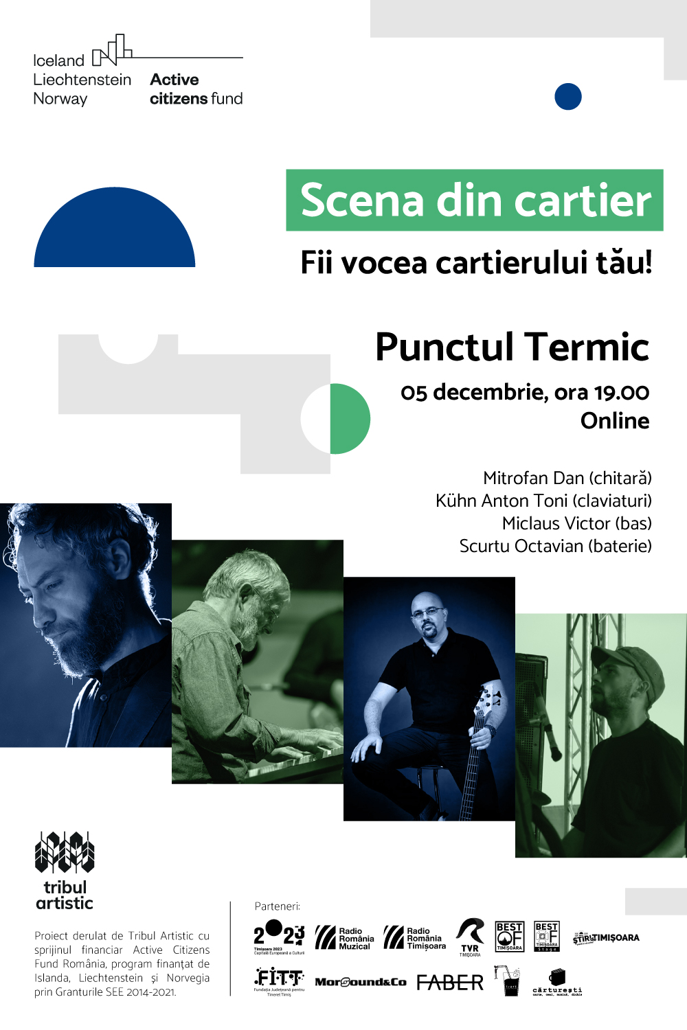 Proiectul ”Scena din cartier” (14 noiembrie – 20 decembrie 2020) este derulat de Tribul Artistic și se adresează muzicienilor locali a căror activitate a fost grav afectată de pandemie.