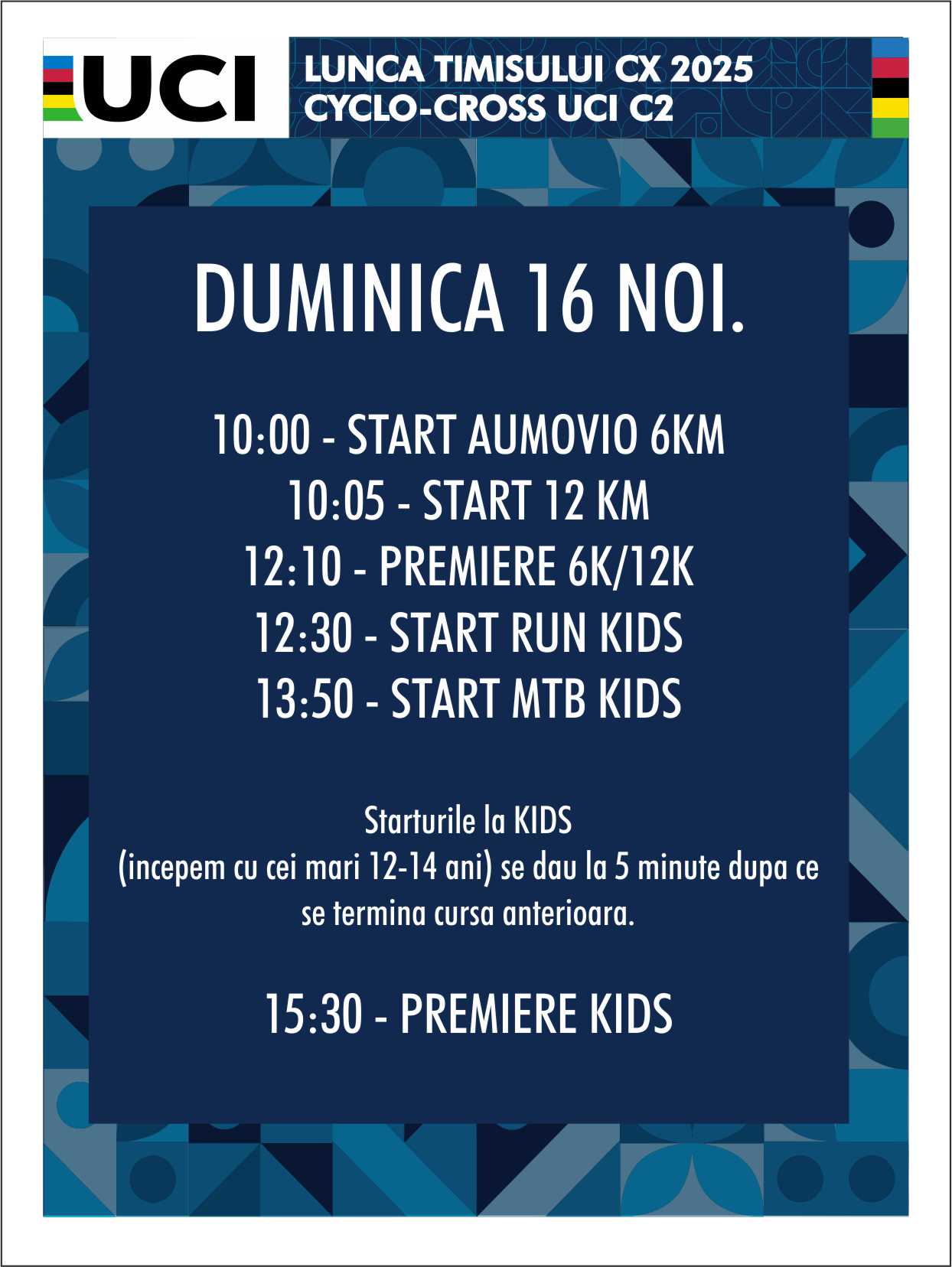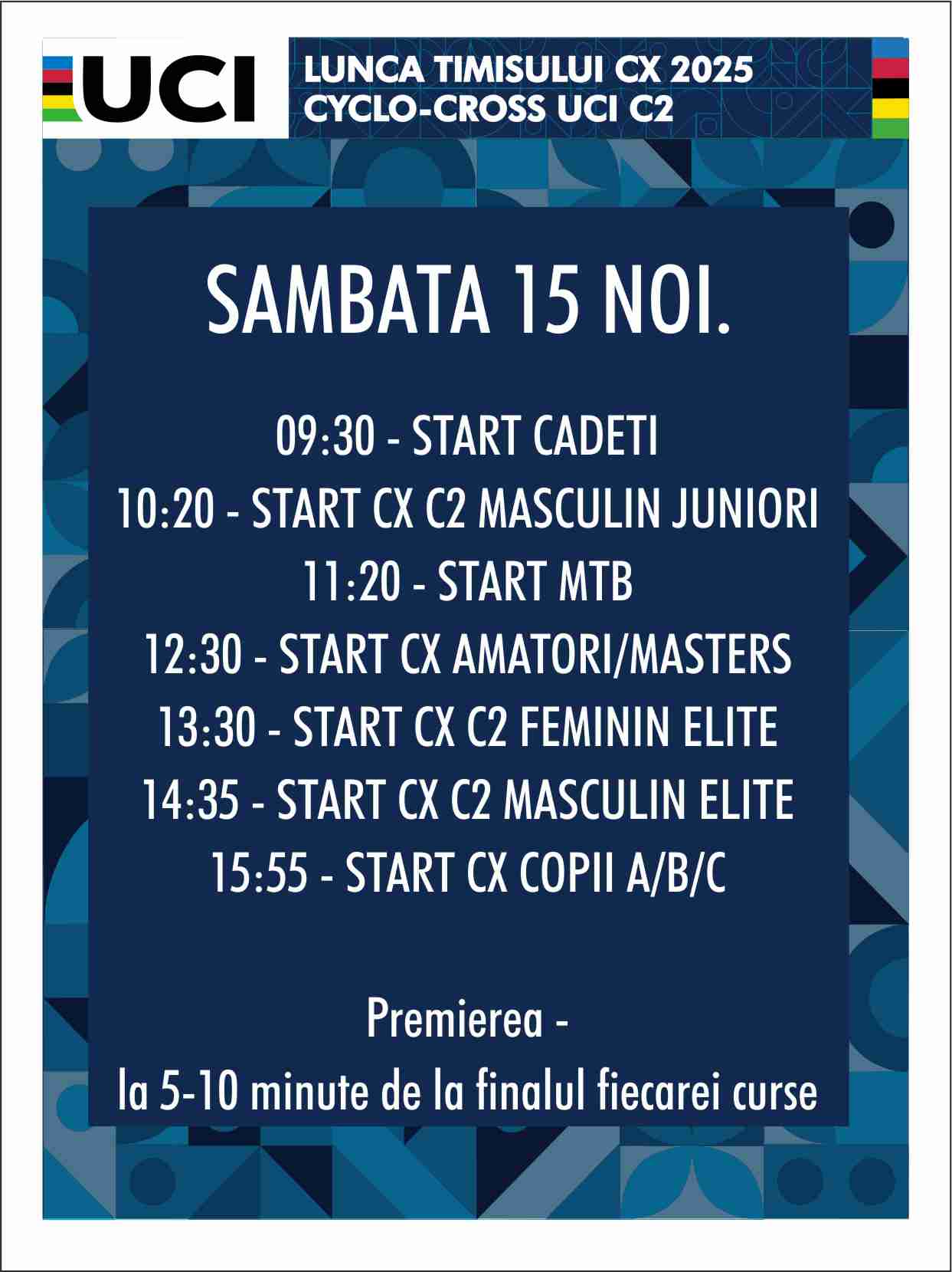 Înscrierile pentru a 9-a ediție Lunca Timișului CX se mai pot face doar până duminică, 9 noiembrie 2025, excepție făcând cursele internaționale de ciclocros, UCI C2, pentru care ultima zi de înscrieri este 12 noiembrie.