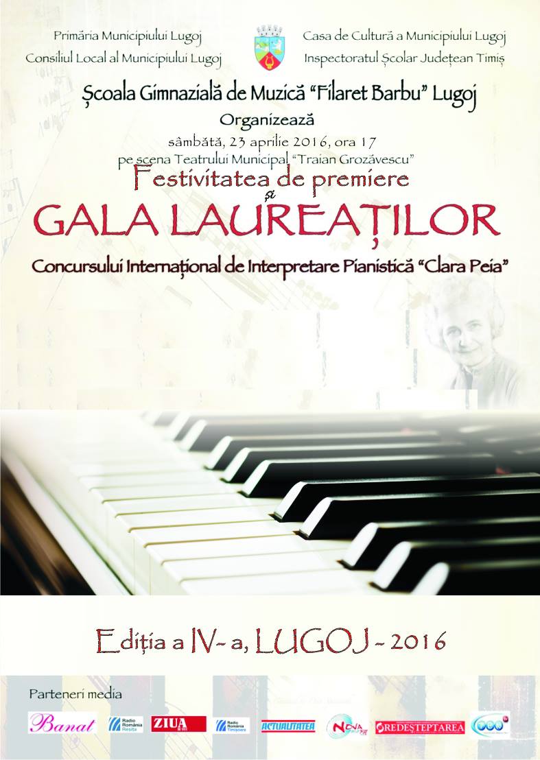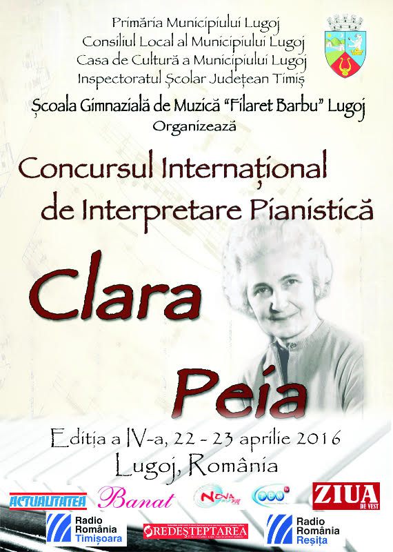 Şcoala Gimnazială de Muzică “Filaret Barbu” din Lugoj organizează ediţia a patra a Concursului de Interpretare Pianistică „Clara Peia” vineri, 22 şi sâmbătă, 23 aprilie 2016.