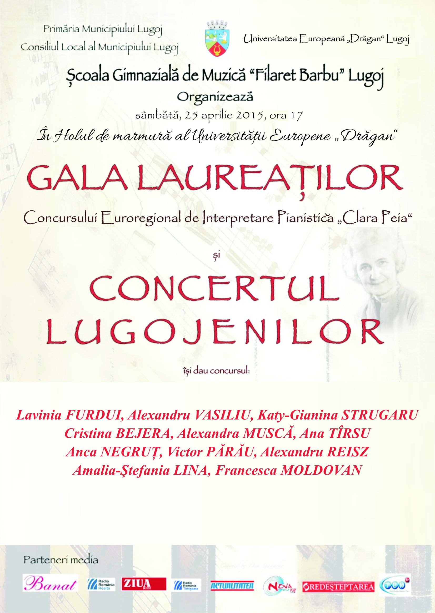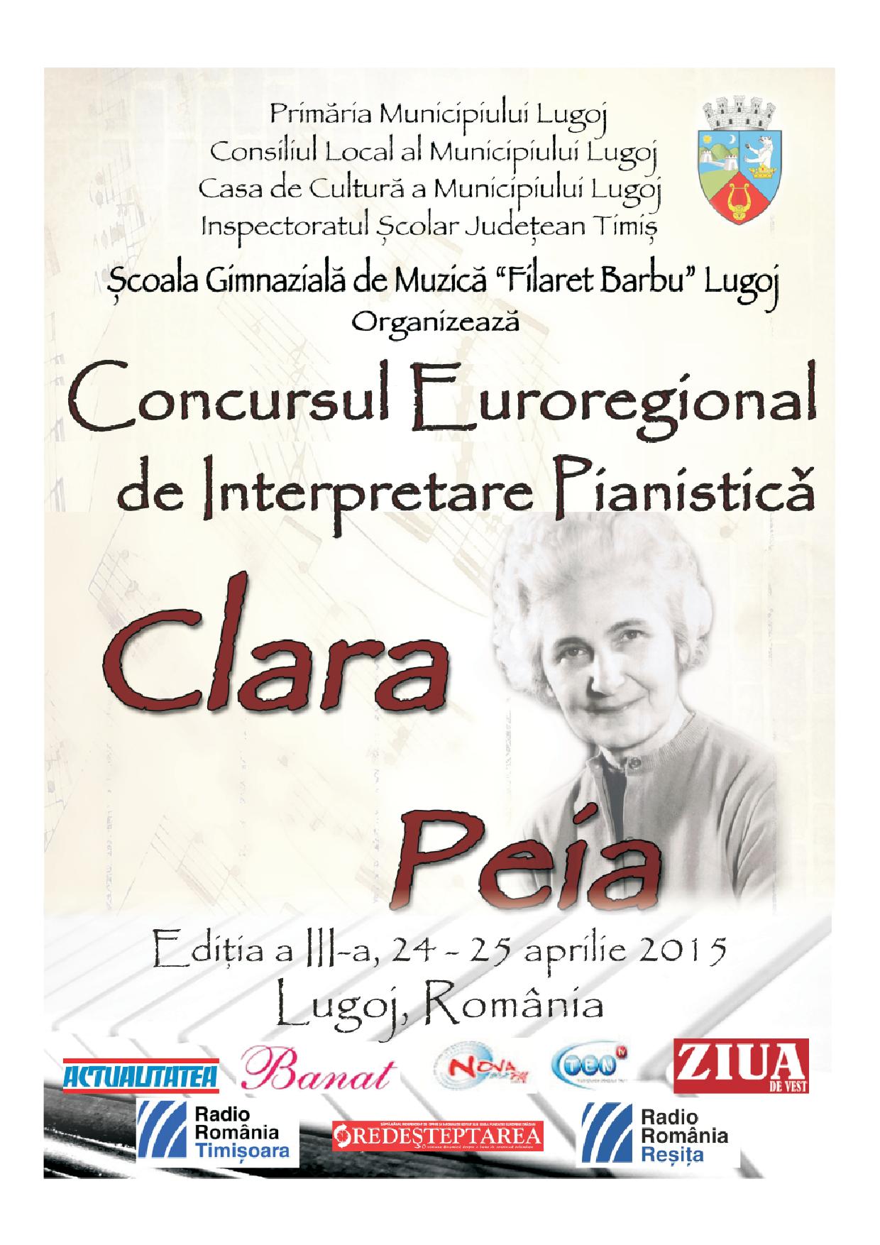 Concursului Euroregional de Interpretare Pianistică „Clara Peia”, destinat micilor pianişti, a ajuns anul acesta la a III-a ediţie şi va avea loc la Lugoj, în perioada 24-25 aprilie 2015.