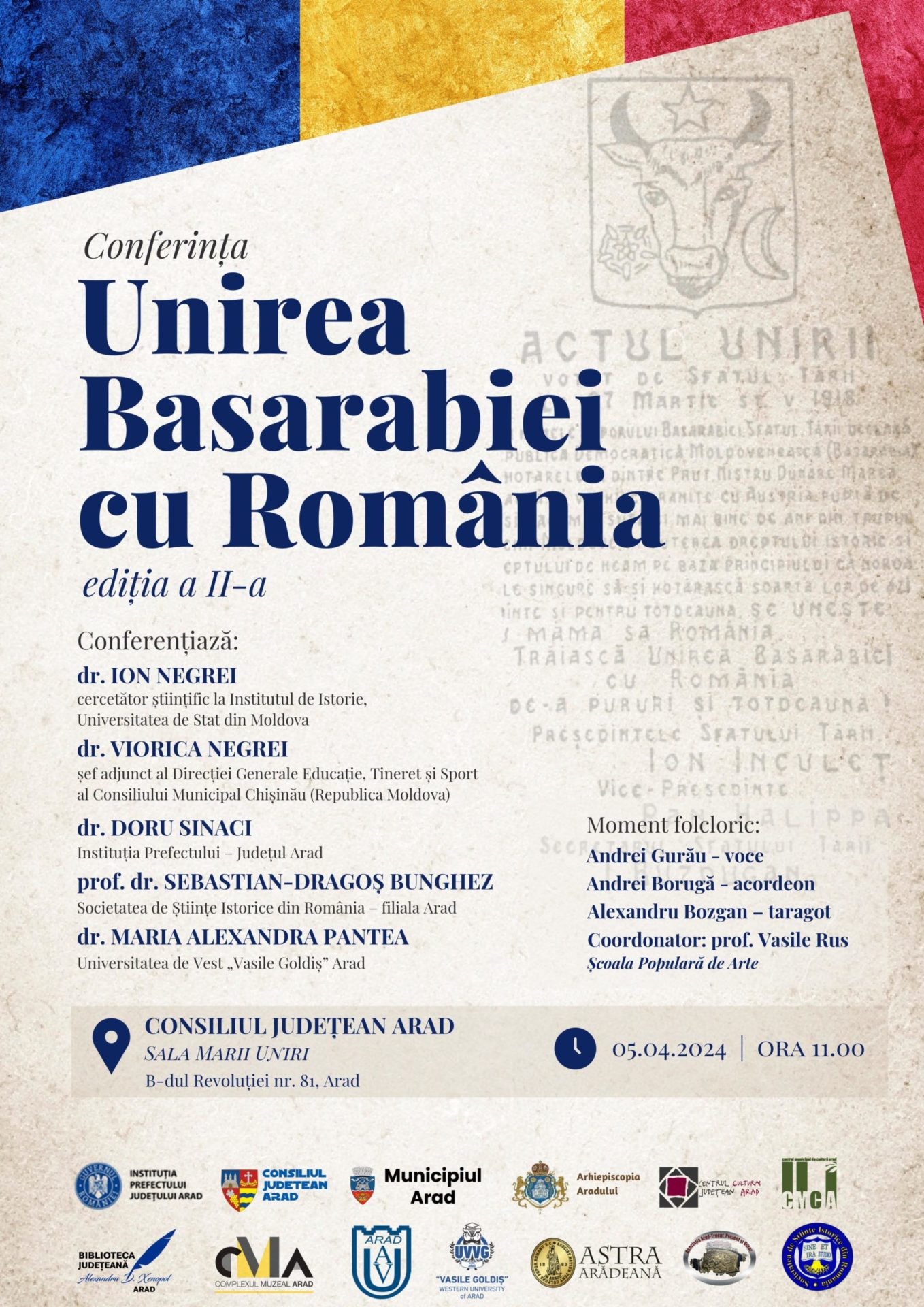La Arad, acest moment istoric va fi marcat de conferința științifică „Unirea Basarabiei cu România – începutul Marii Uniri”, aflată la cea de-a doua ediție, care se va desfășura vineri, 05 aprilie 2024, începând cu orele 11:00, în Sala Marii Uniri.
