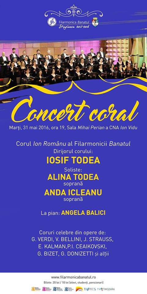 Corul ”Ion Românu” al Filarmonicii Banatul din Timișoara susține marți, 31 mai 2016, de la ora 19.00 un concert pe scena Sălii Mihai Perian a Colegiului Național de Artă ”Ion Vidu” din Timișoara.