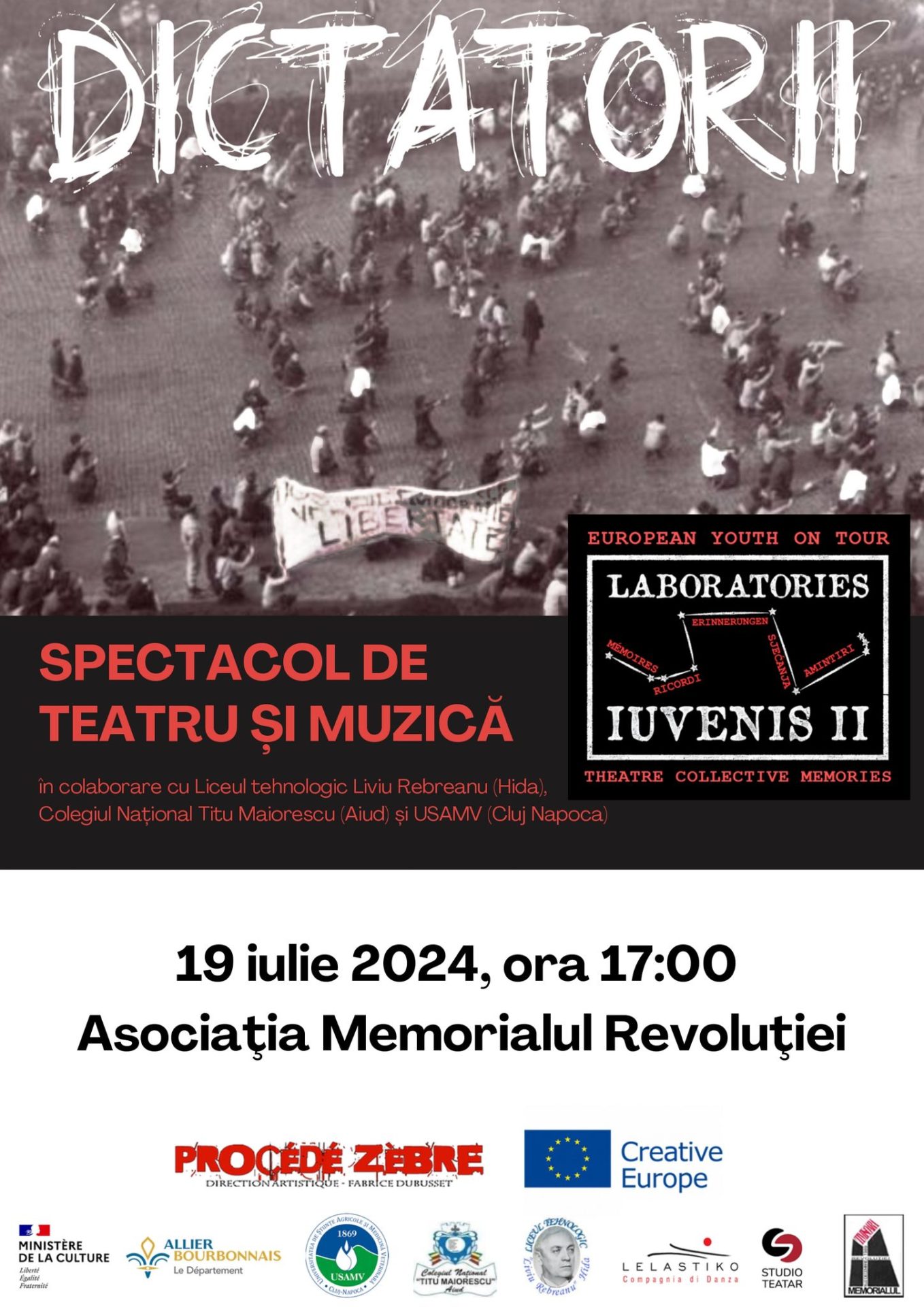Memorialul Revoluției din Timișora găzduiește vineri, 19 iulie 2024, de la ora 19.00, spectacolul „Dictatorii”, o creație din 2022 a companiei Procédé Zèbre, cu participarea elevilor de la Colegiul Național „Titu Maiorescu” – Aiud, Liceul Tehnologic „Liviu Rebreanu” – Hida, Universitatea de Științe Agricole și Medicină Veterinară – Cluj-Napoca.