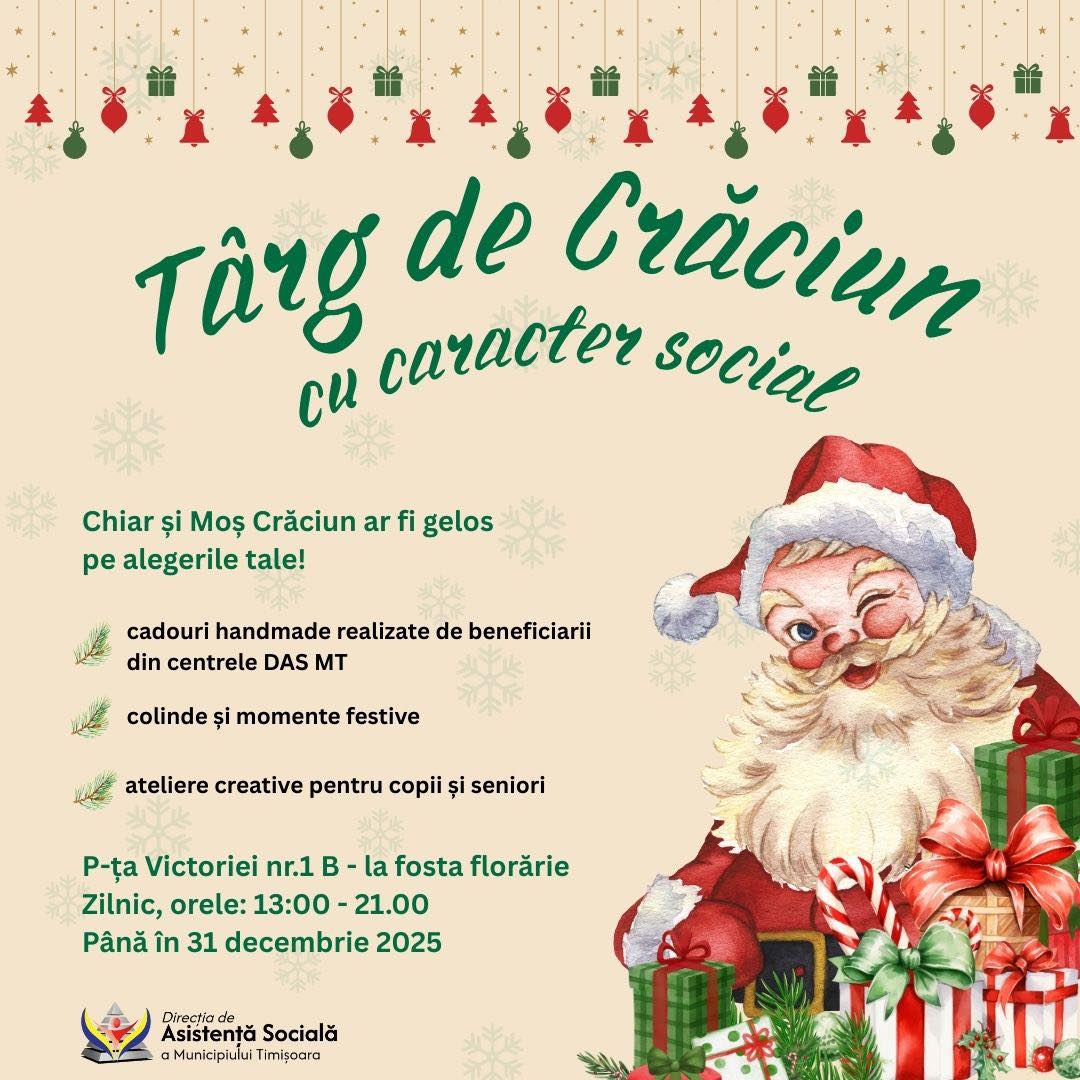 Direcția de Asistență Socială Timișoara cu sprijinul Primăriei Municipiului Timișoara organizează Târgul de Crăciun cu caracter social, un eveniment la care întreaga comunitate este așteptată pentru a afla mai multe despre activitățile și serviciile oferite de către DAS MT, dar și pentru momente cu bucurie, surprize și întâlniri cu poveștile oamenilor plini de energie și creativitate din centrele sociale.
