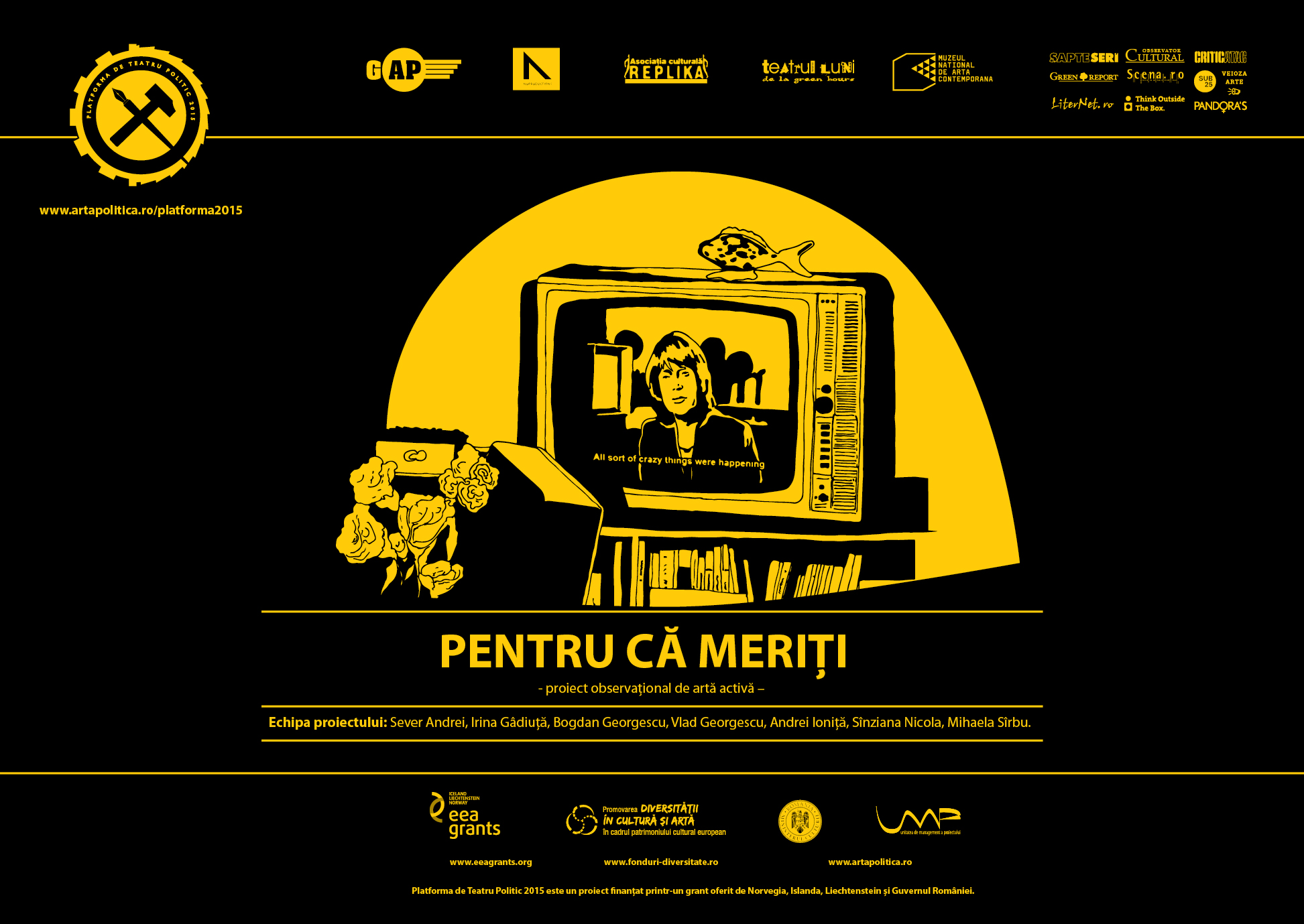 Platforma de Teatru Politic 2015 vă așteaptă duminică, 6 decembrie 2015, de la ora 19.00, la Sala 2 a Teatrului Național Timișoara, la spectacolul „Ce-am fi dac-am ști. Feerie politică protestatară” și luni, 7 decembrie, tot de la ora 19.00, în aceeași sală, la spectacolul „Pentru că Meriți”.
