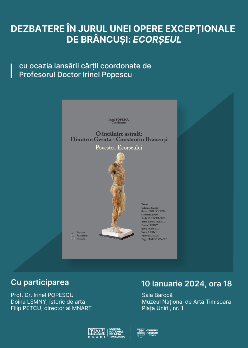 Muzeul Naţional de Artă Timişoara vă invită miercuri, 10 ianuarie 2024, ora 18.00, la lansarea volumului „O întâlnire astrală: Dimitrie Gerota – Constantin Brâncuşi. Povestea Ecorşeului” a reputatului profesor Irinel Popescu.