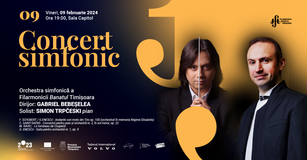 Pianistul macedonean Simon Trpčeski are, în cariera sa, peste o sută de colaborări cu orchestre de pe patru continente. El urcă pe scena Sălii Capitol înr-un concert simfonic care îl are la pupitru pe Gabriel Bebeșelea. Acesta a ales, în deschidere, lucrarea „Andante con moto din Trio op. 100”, orchestrată în memoria Reginei Elisabeta, de Schubert / Enescu. În continuare, Simon Trpčeski va interpreta, alături de Orchestra simfonică a Filarmonicii Banatul, „Concertul pentru pian și orchestră nr. 2, în sol minor, op. 22”, de C. Saint-Saens. Urmează „Le tombeau de Couperin”, de M. Ravel, iar concertul se încheie cu „Suita pentru orchestră nr. 1, op. 9”, de G. Enescu.
