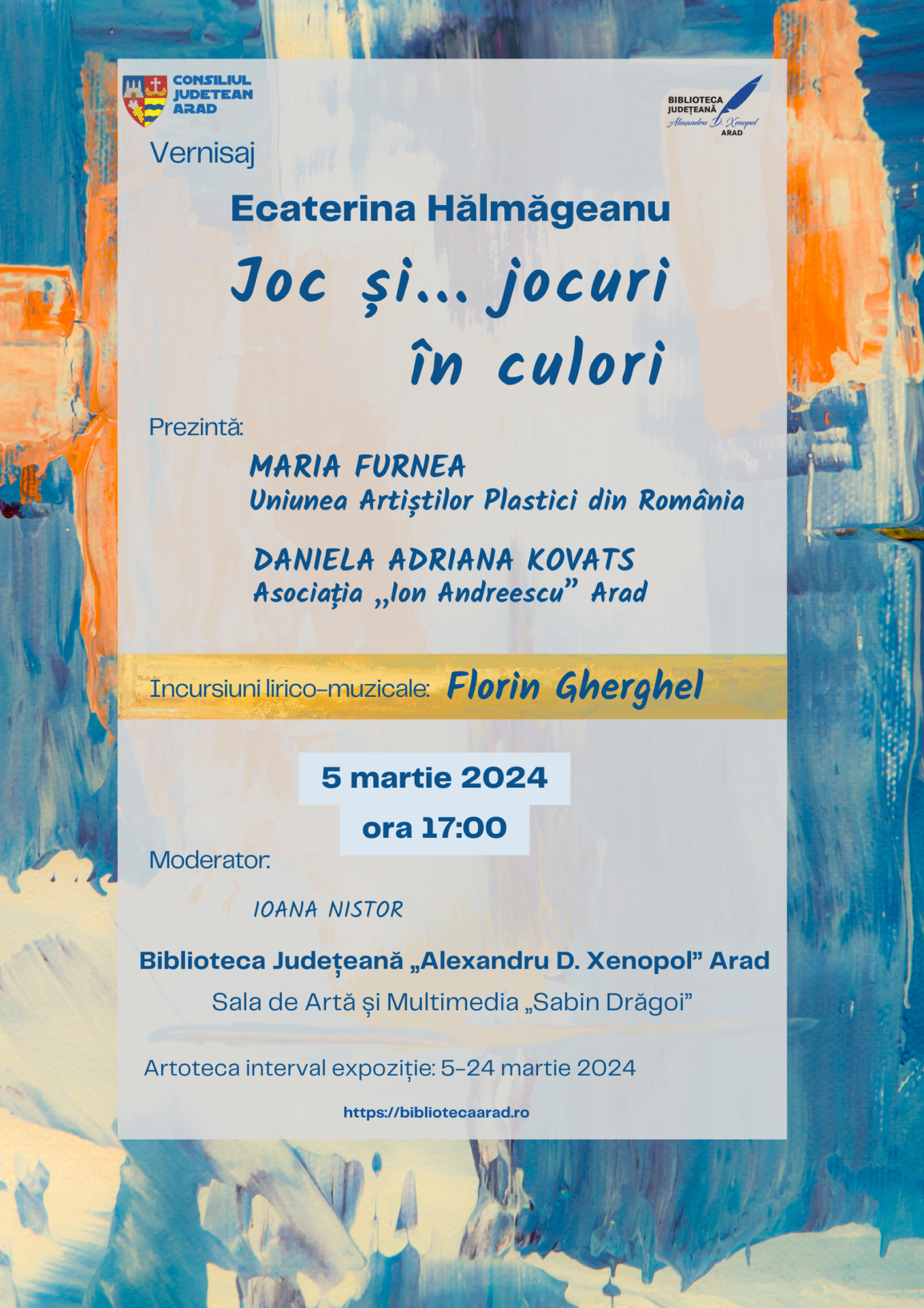 Biblioteca Județeană „Alexandru D. Xenopol” din Arad vă invită marți, 5 martie 2024, ora 17.00, la vernisajul expoziției de pictură cu titlul „Joc și… jocuri de culori” a artistului plastic Ecaterina Hălmăgeanu.