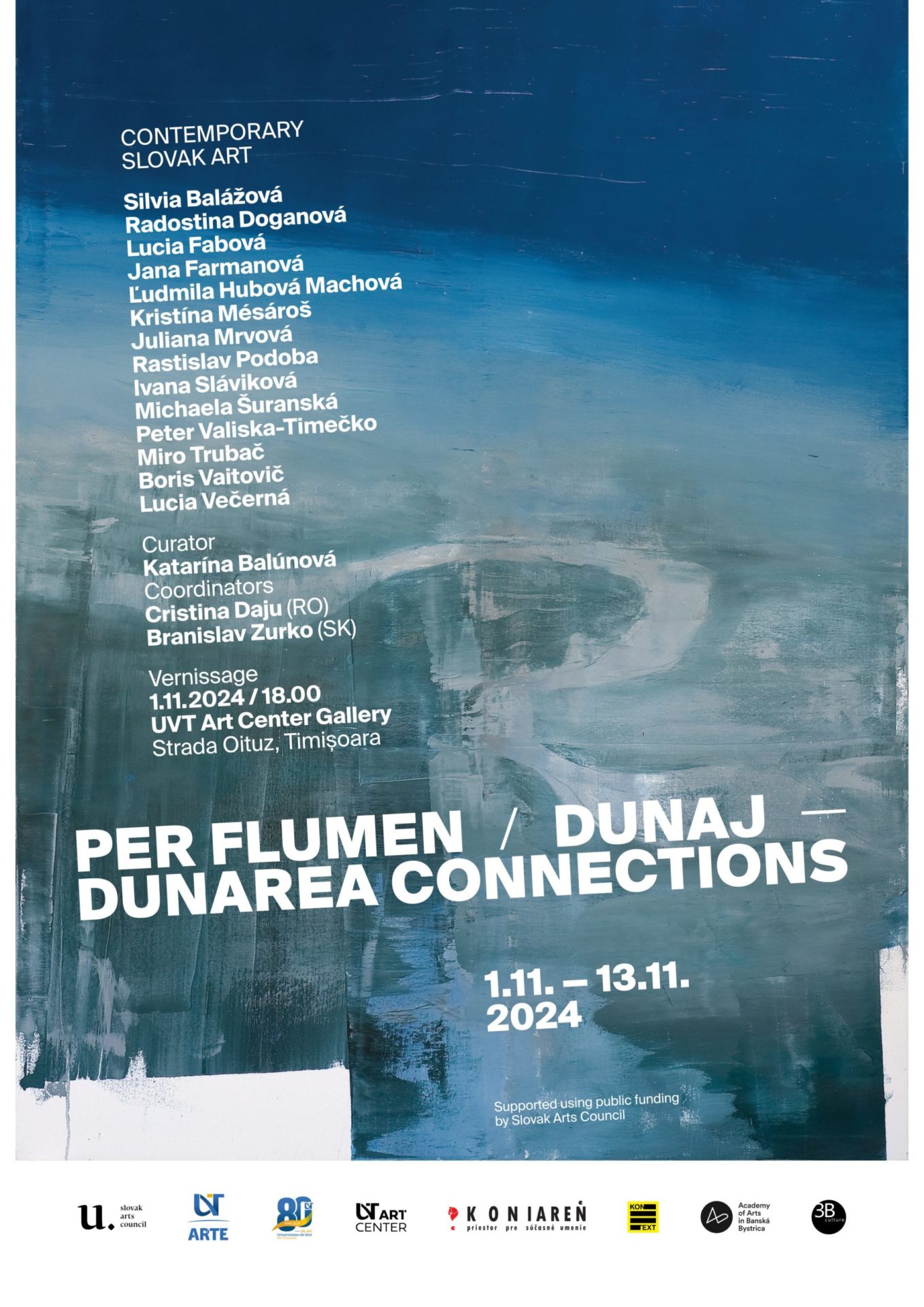 Paisprezece artişti contemporani slovaci își expun lucrările pe simezele galeriei de artă a Universității de Vest Timișoara, UVT Art Center, în cadrul expoziției Per Flumen|Conexiunile Dunării. Vernisajul va avea loc în data de 1 noiembrie, la ora 18:00 şi este coordonat de către artiştii vizuali Cristina Daju & Branislav Zurko.