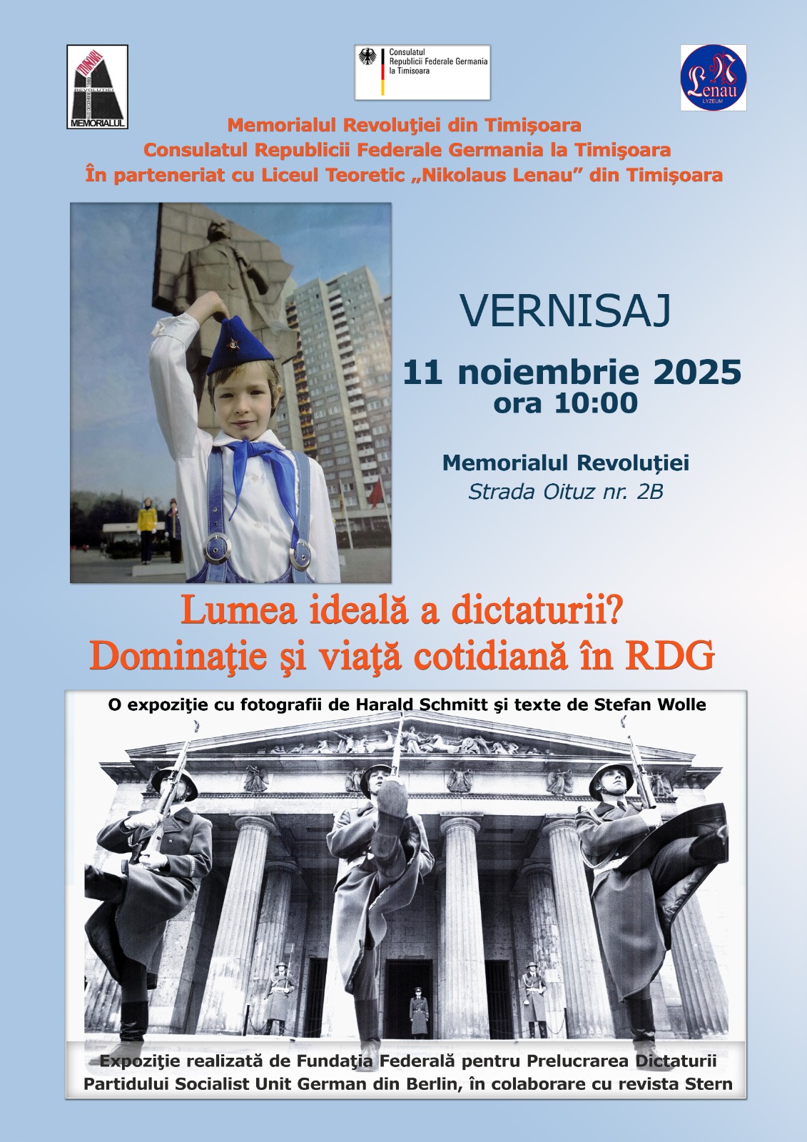 Memorialul Revoluției din Timișoara, în parteneriat cu Consulatul Republicii Federale Germania la Timișoara și Liceul Teoretic „Nikolaus Lenau”, vă invită marți, 11 noiembrie 2025, ora 10:00, la vernisajul expoziției Lumea ideală a dictaturii? Dominație și viață cotidiană în RDG, ce va avea loc la sediul Memorialului Revoluției.