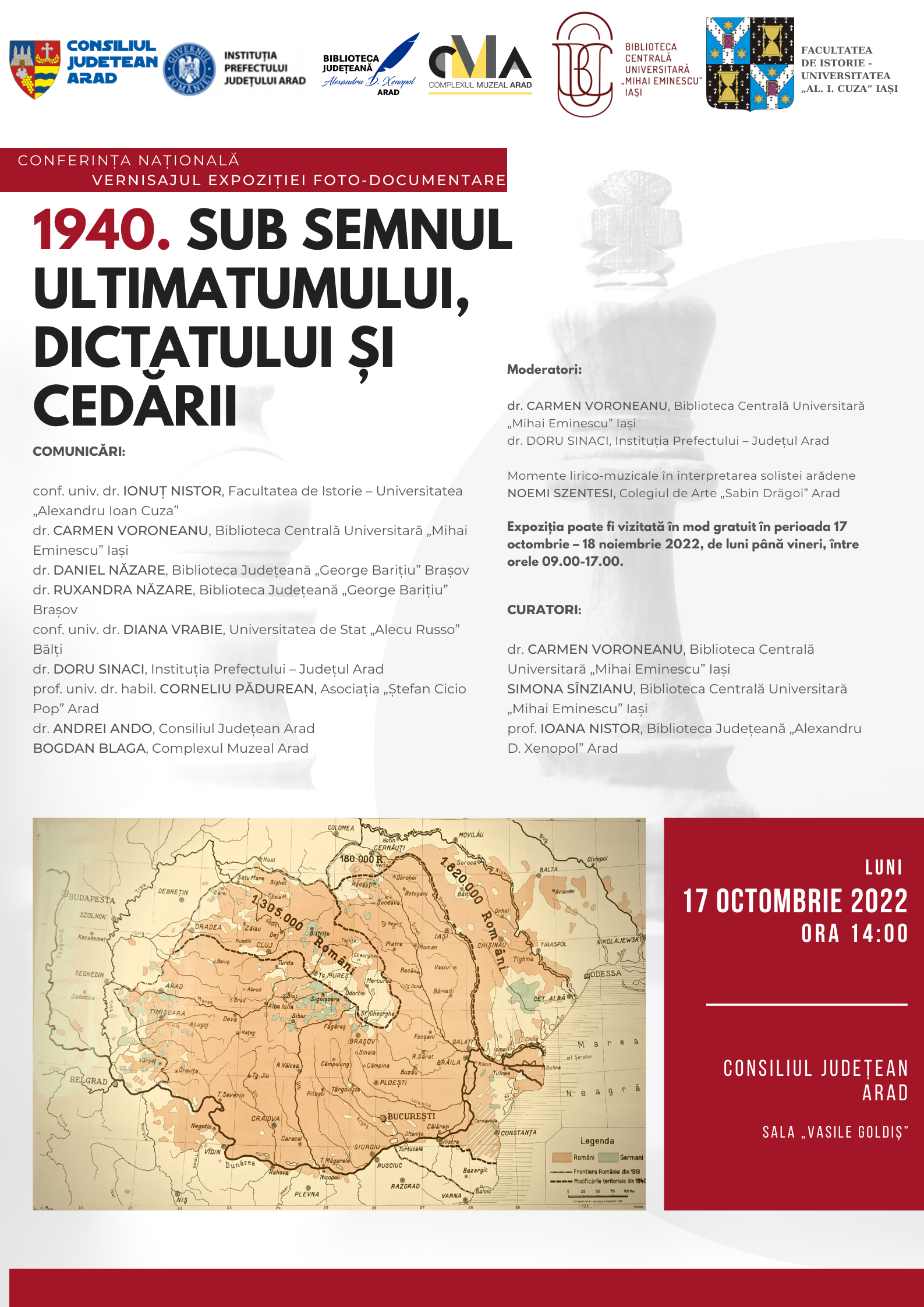 Luni, 17 octombrie 2022, începând cu ora 14:00, vor avea loc în Sala „Vasile Goldiș” a Consiliului Județean Arad Conferința Națională și deschiderea expoziției foto-documentare cu titlul „1940. Sub semnul ultimatumului, dictatului şi cedării”.