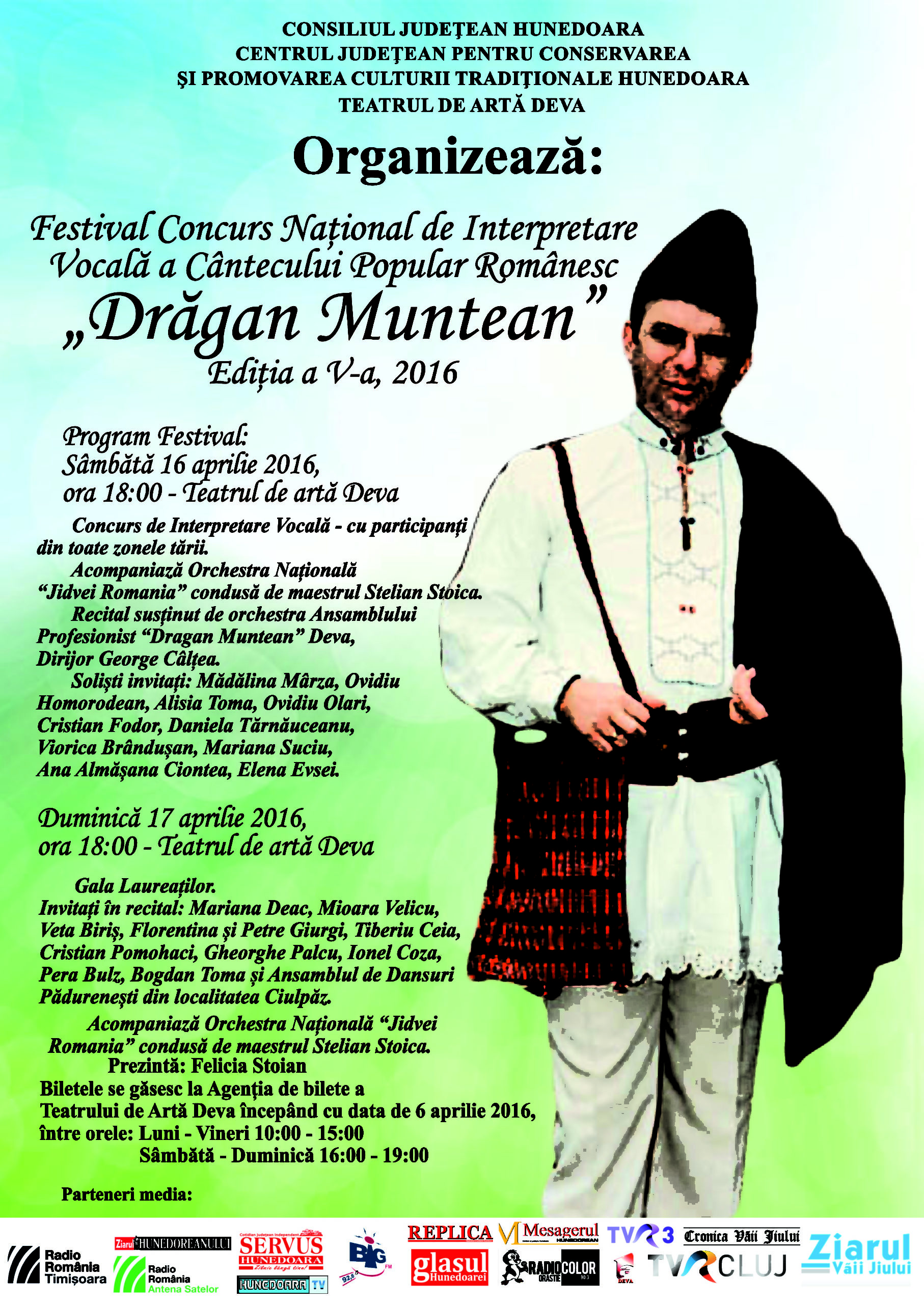 Zeci de solişti de muzică populară din toate zonele ţării sunt aşteptaţi la a V-a ediție a Festivalului Concurs Naţional de interpretare vocală a cântecului popular „Drăgan Muntean” sâmbătă, 16 şi duminică, 17 aprilie 2016, la Teatrul de Artă din Deva.