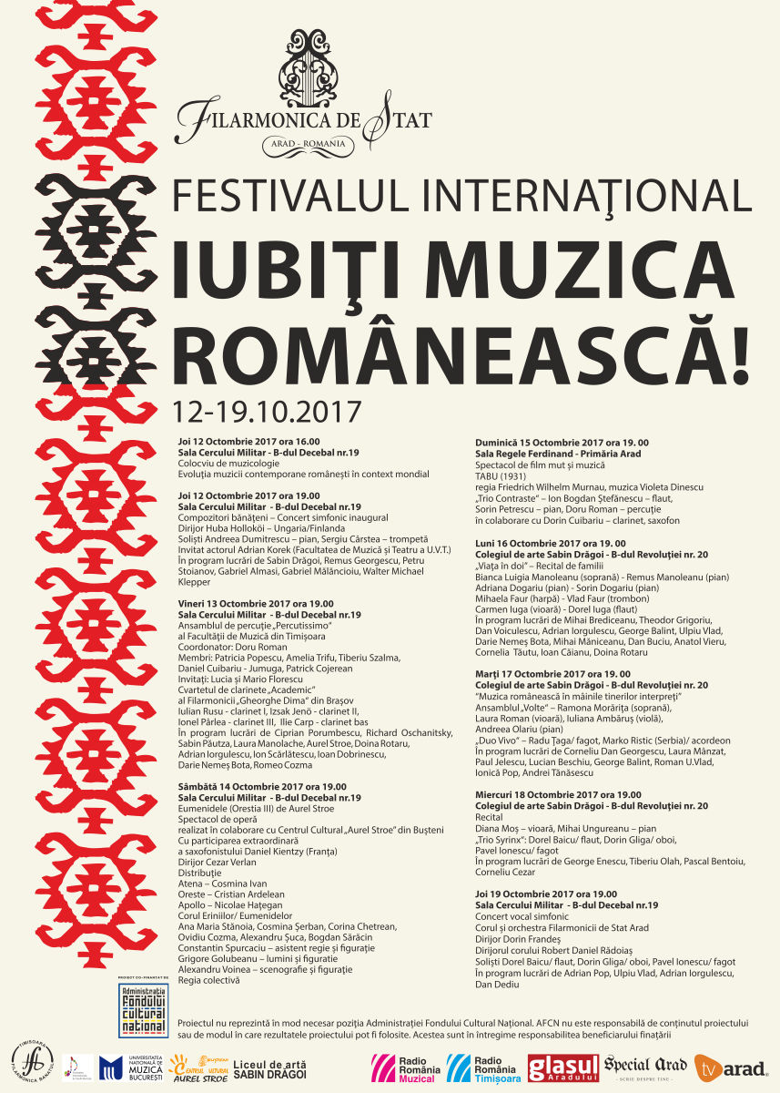 Prima ediție a Festivalului „Iubiţi Muzica Românească!”, un proiect co-finanţat de Administraţia Fondului Cultural Naţional, va avea loc în perioada 12 -19 octombrie 2017, marcând unul dintre vârfurile anului muzical arădean.