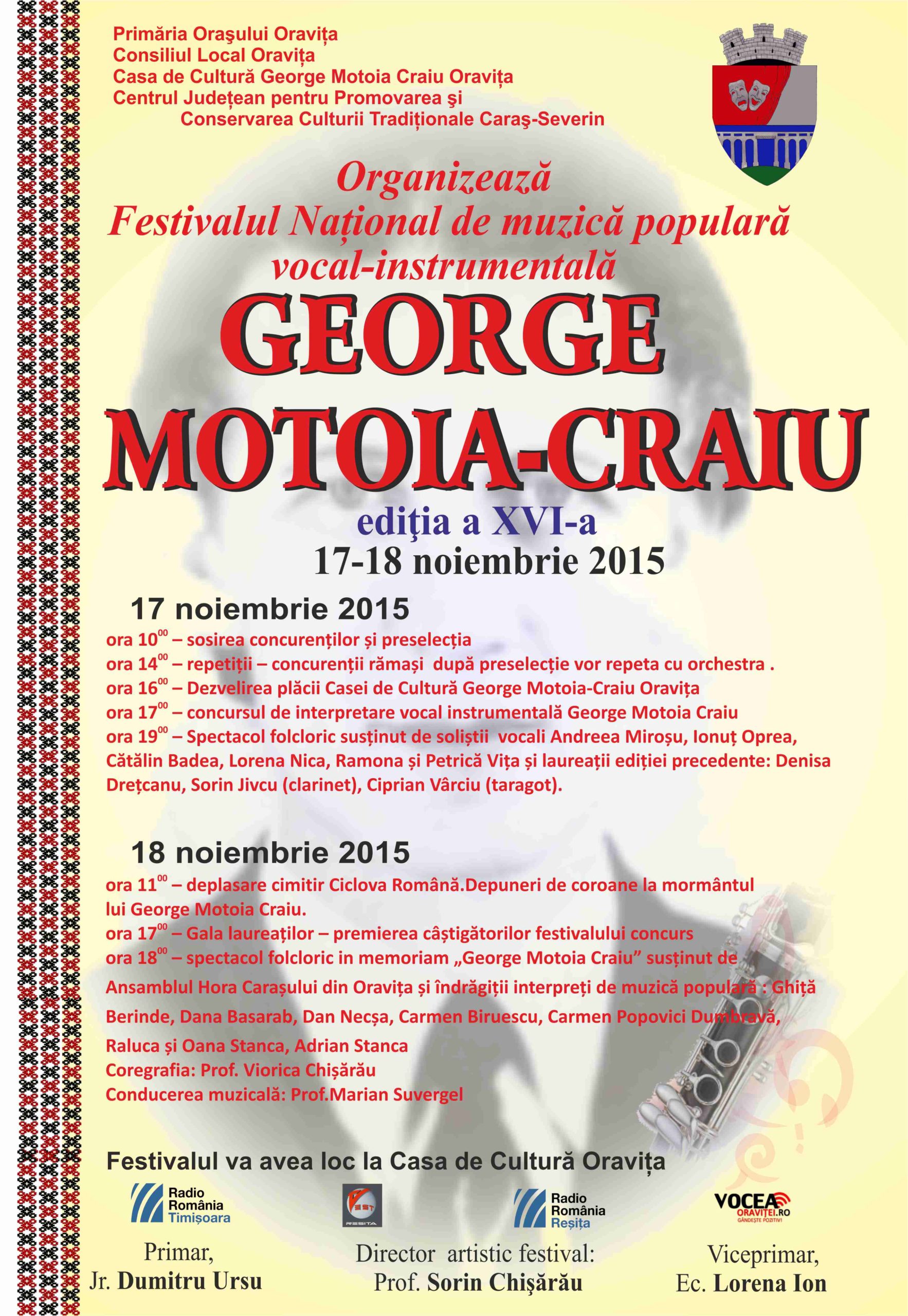 Ediţia a XVI-a Festivalului Naţional de muzică populară „George Motoia Craiu” va avea loc în zilele de 17 şi 18 noiembrie 2015 la Casa de Cultură din Oraviţa. Recent, festivalul a primit numele instrumentistului omagiat, iar dezvelirea plăcii va avea loc în deschiderea festivalului, marţi 17 noiembrie, de la ora 16.00.