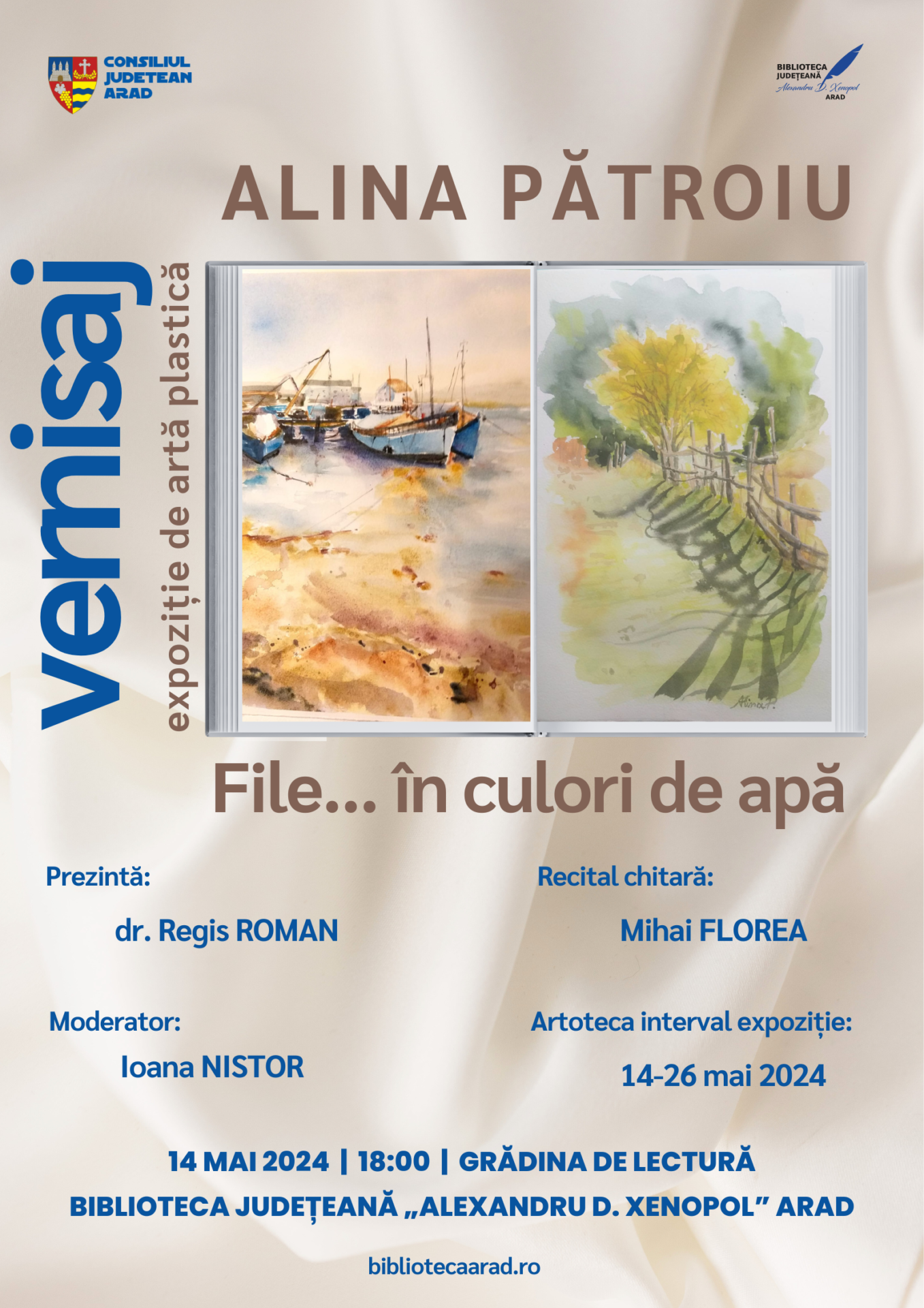 Dialogul cultural ce va avea loc în Grădina de Lectură a Bibliotecii Județene „Alexandru D. Xenopol” Arad, susținut de dr. Regis Roman și artistul expozant Alina Pătroiu, va explora teme precum arta, acuarela, talentul și creativitatea. De asemenea, vă invităm să vă bucurați de momentele muzicale oferite de talentatul chitarist Mihai Florea, care va completa experiența culturală.