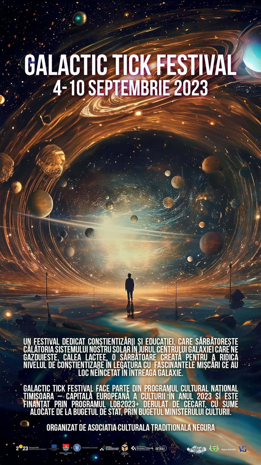 „Galactic Tick Festival este un proiect cultural care își propune creșterea nivelului de conștientizare și educație în cadrul comunității locale, prin sărbătorirea mișcării sistemului nostru solar în jurul centrului Căii Lactee. Festivalul se aliniază unei mișcări internaționale prin intermediul unor evenimente culturale dedicate unei zi, în care celebrăm locul nostru în univers, știința, arta și umanitatea.”, spun organizatorii, Asociația Culturală Tradițională Negura.