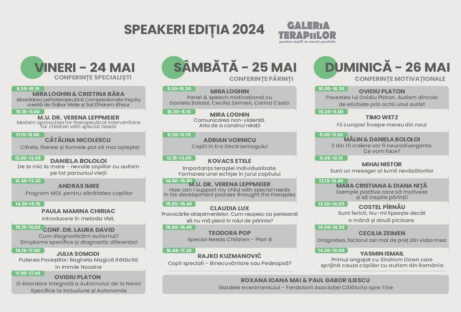 Prima zi a evenimentului, 24 mai, va fi dedicată celor 10 de prezentări remarcabile ale specialiștilor și terapeuților naționali și internaționali, cu vastă experiență, privind terapia, educația și incluziunea socială.