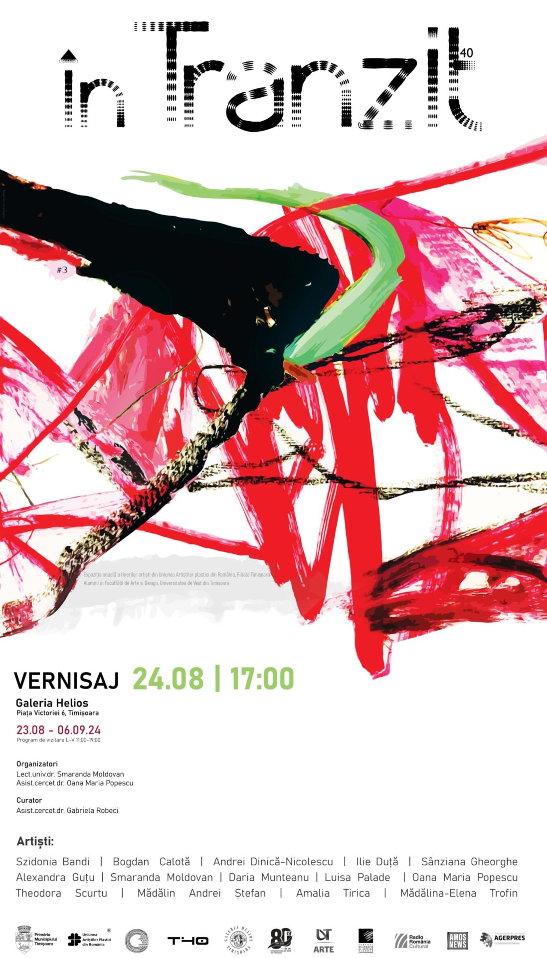 Expoziția În tranzit organizată de grupul de tineret din cadrul filialei Uniunii Artiștilor Plastici filiala Timișoara, T40, va avea vernisajul sâmbată, 24 august 2024, începând cu ora 17.00, la Galeria de Artă Helios din Timișoara. UAP Filiala Timișoara continuă, astfel, seria sa de expuneri ale artiștilor emergenți, cu sprijinul doamnei președinte UAPT prof. univ. dr. Daniela Constantin.